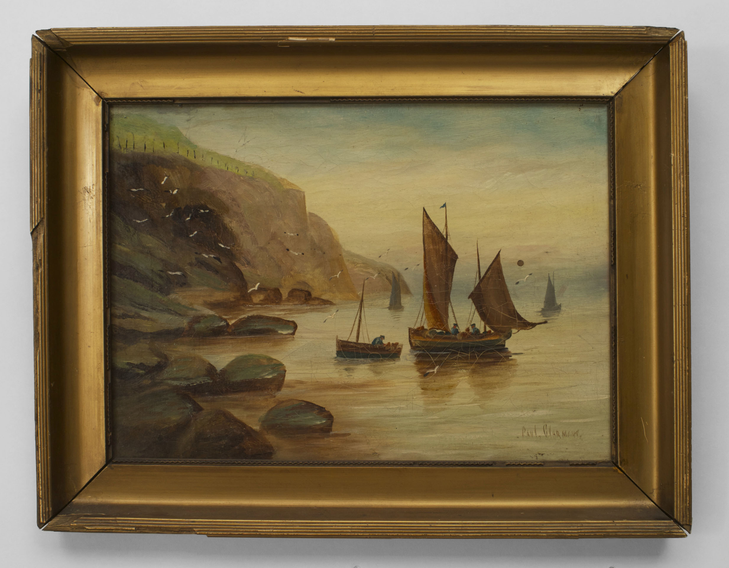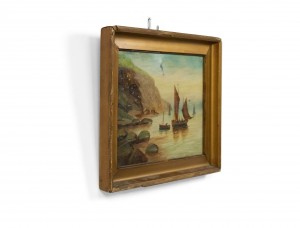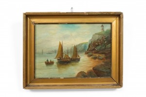 PAIR of English Victorian gilt framed seascape oil paintings of sailboats by shore line..