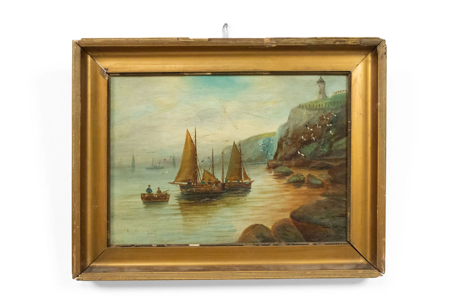 PAIR of English Victorian gilt framed seascape oil paintings of sailboats by shore line.