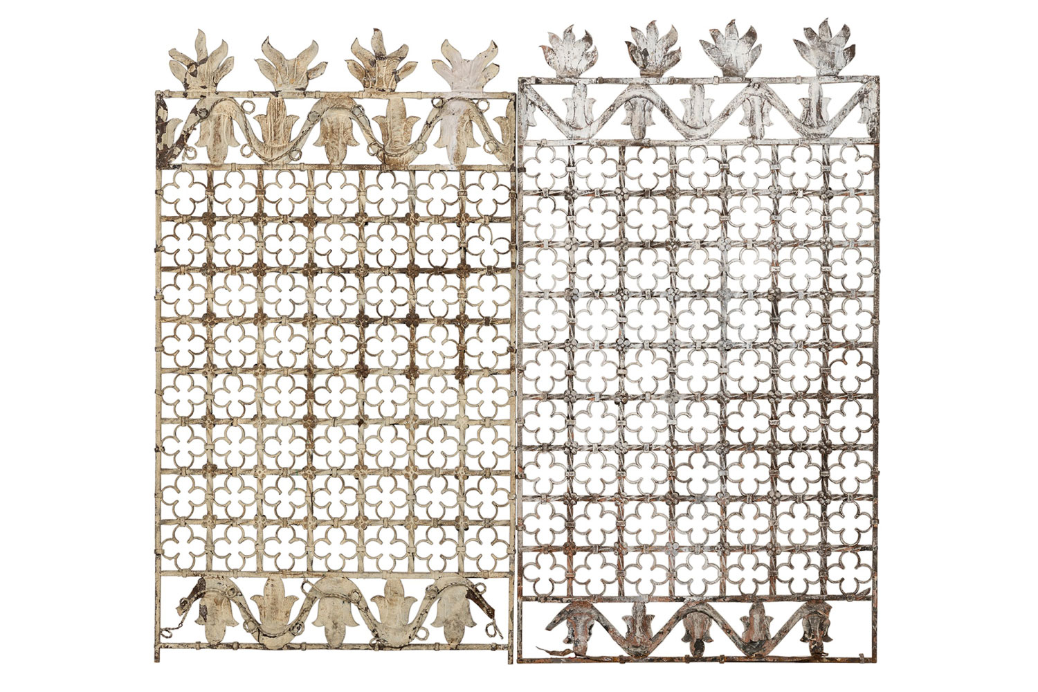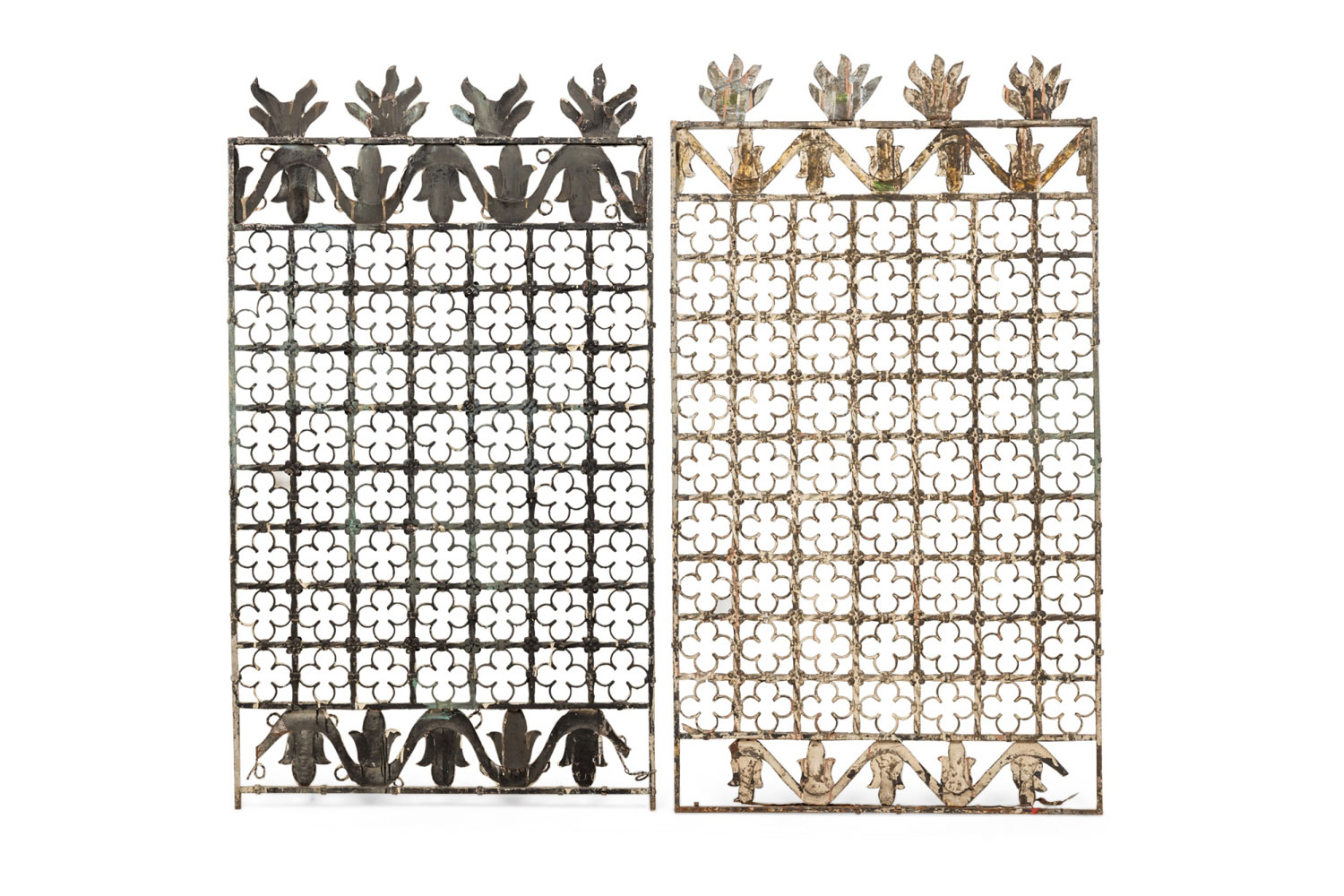 PAIR of English Victorian Gothic style (19/20th Century) painted iron gates with 4 flames on top and clover leaf design (PRICED AS PAIR).