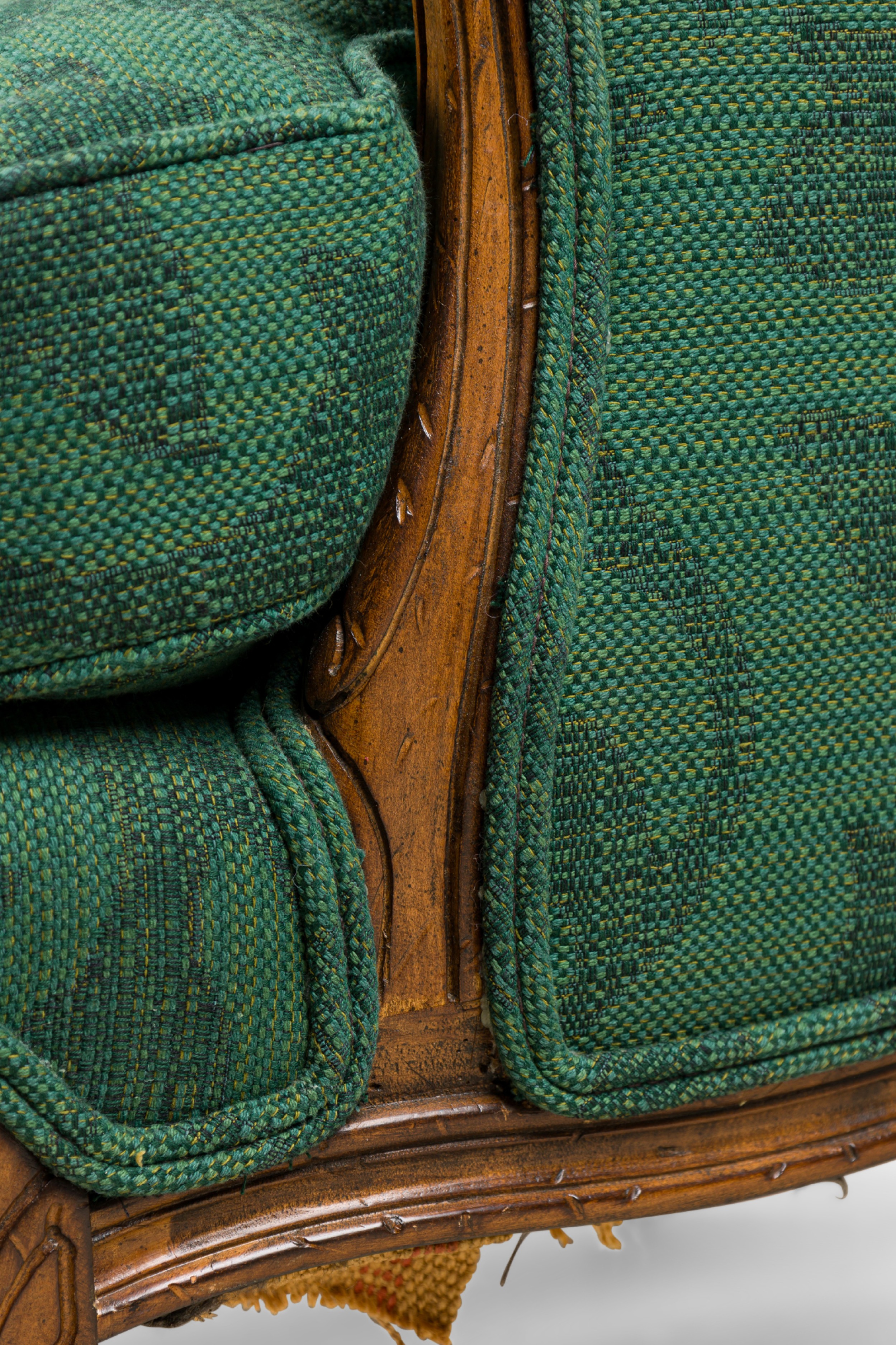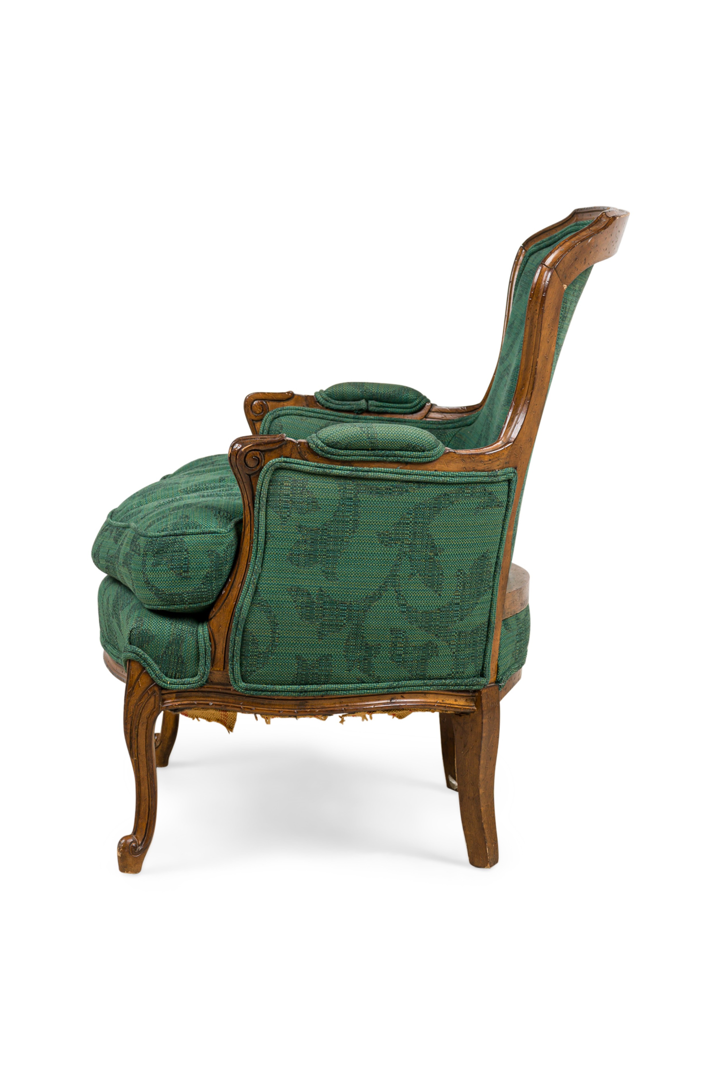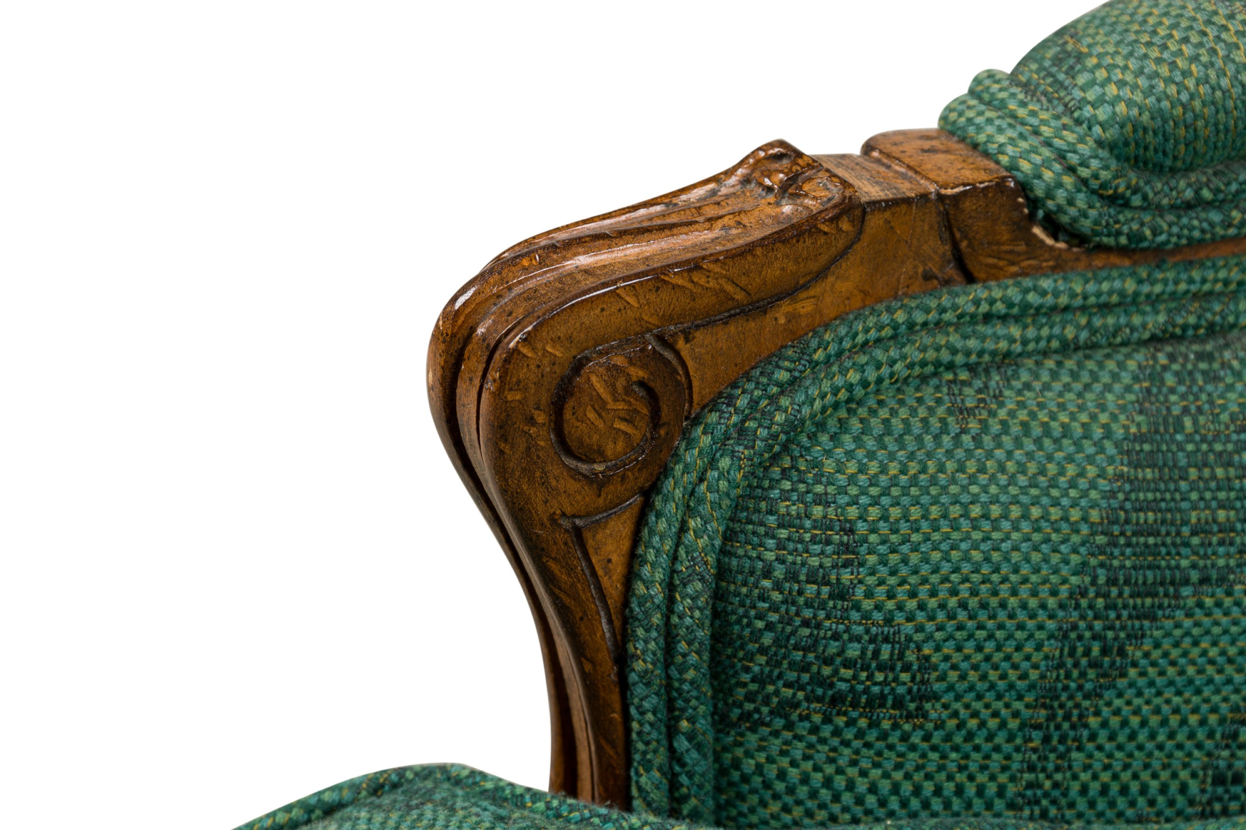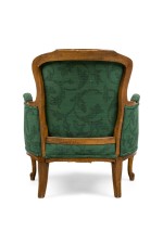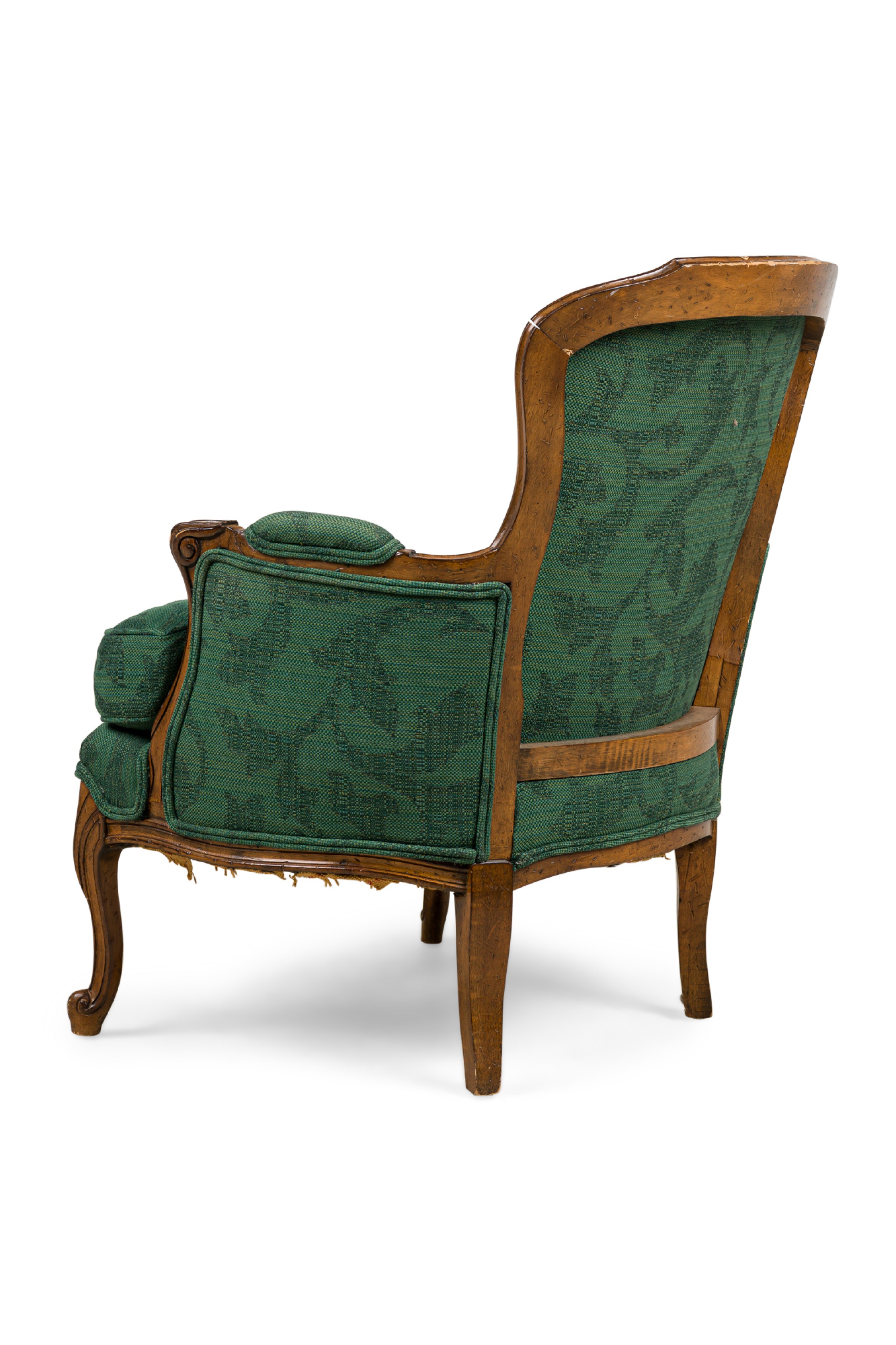 French LXV style Bergere (20th Century) armchair with green upholstery and seat cushion.