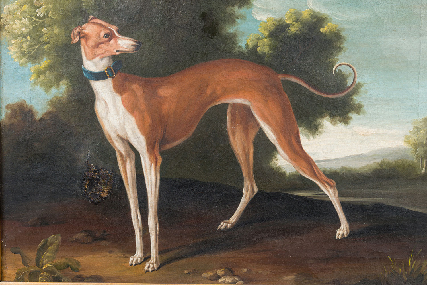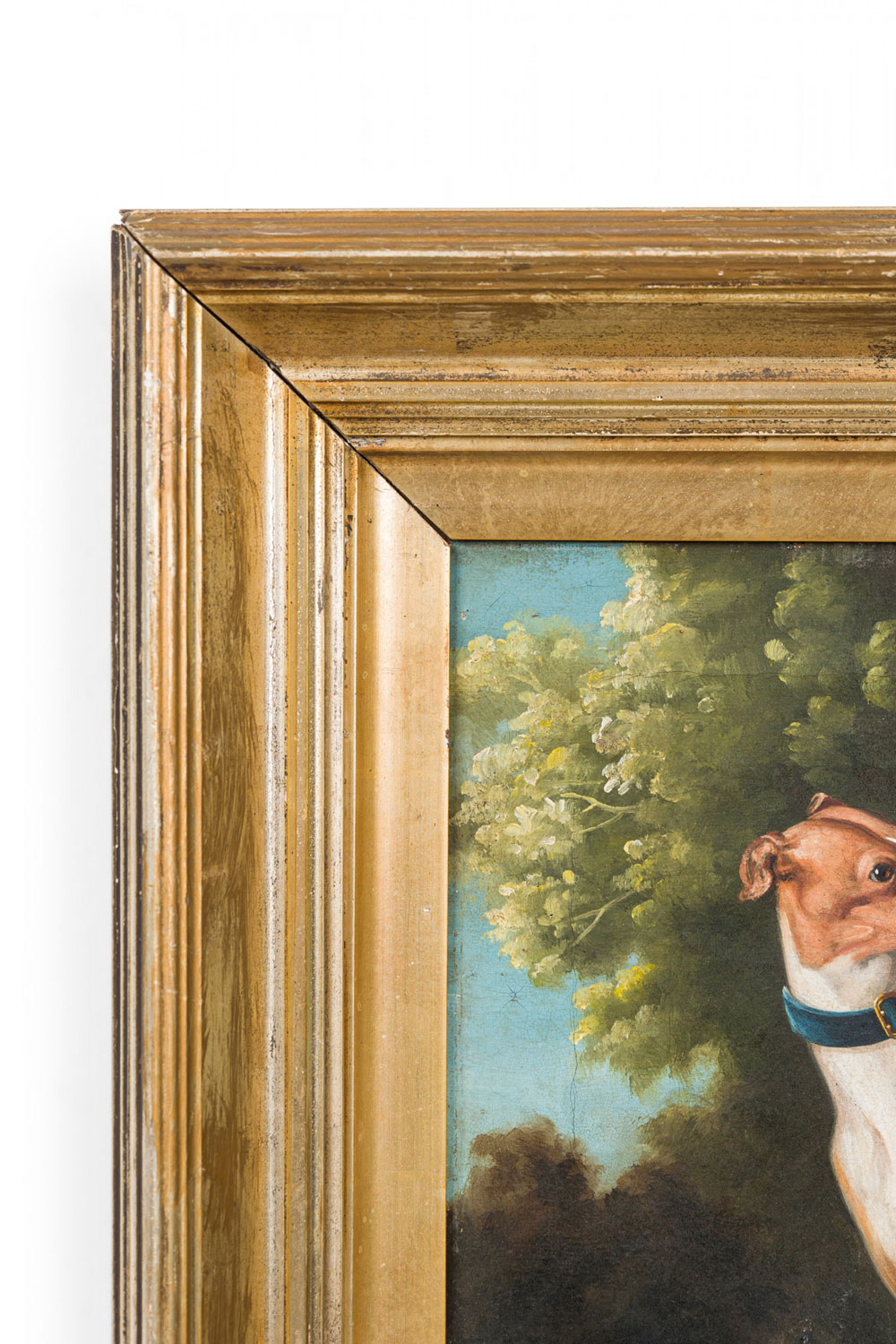 English Victorian style gilt framed oil painting of brown and white greyhound dog..