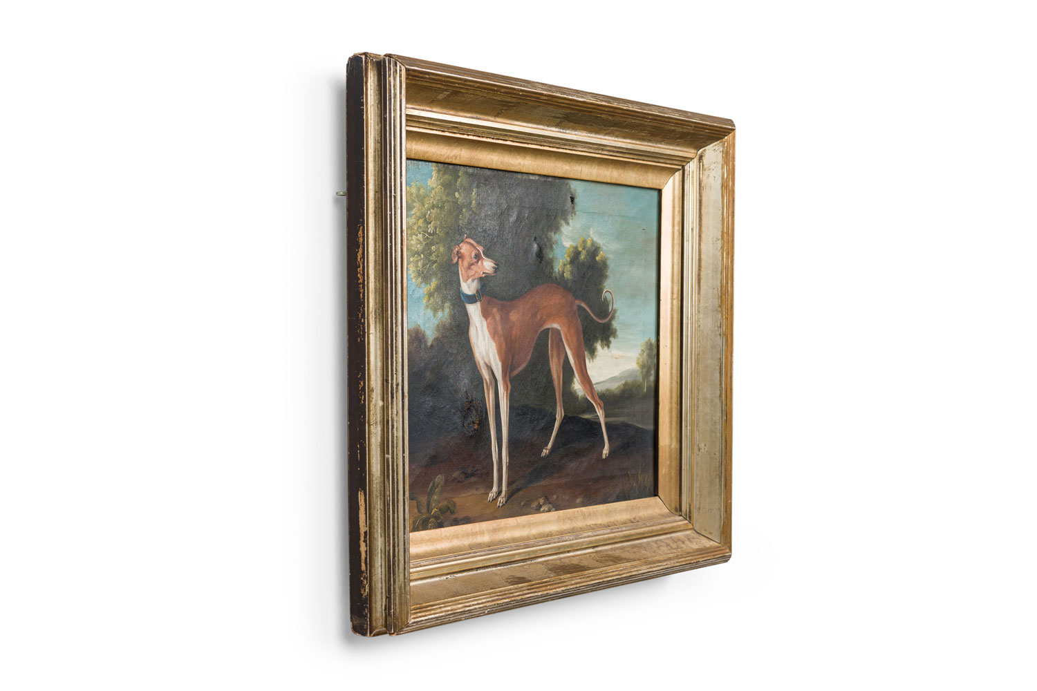 English Victorian style gilt framed oil painting of brown and white greyhound dog.