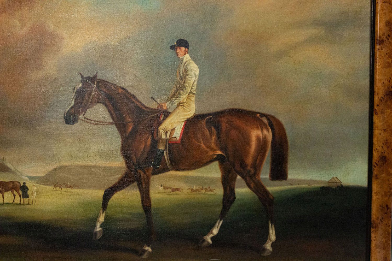 English Victorian style burl walnut framed oil painting of jockey on horse