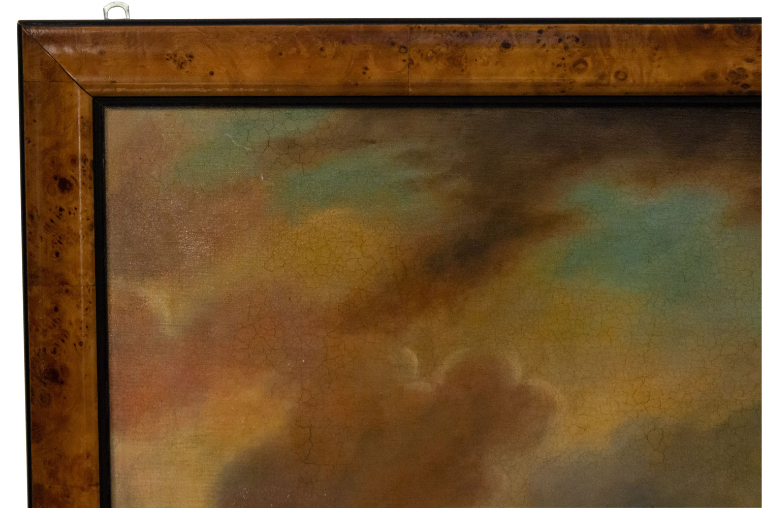 English Victorian style burl walnut framed oil painting of jockey on horse.