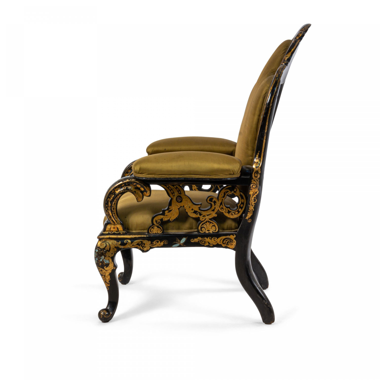 English Victorian Lacquered Papier Mache and Green Satin Armchair