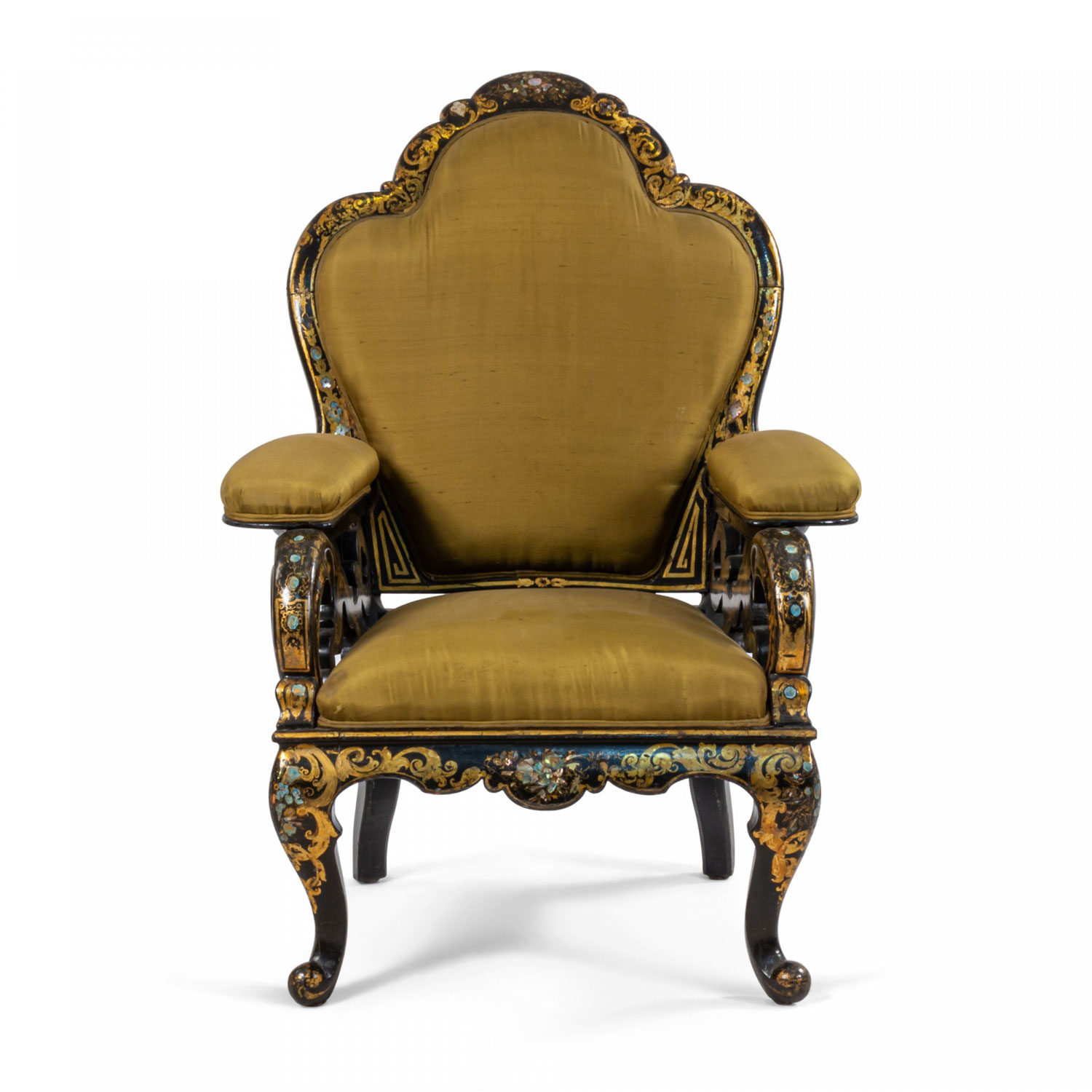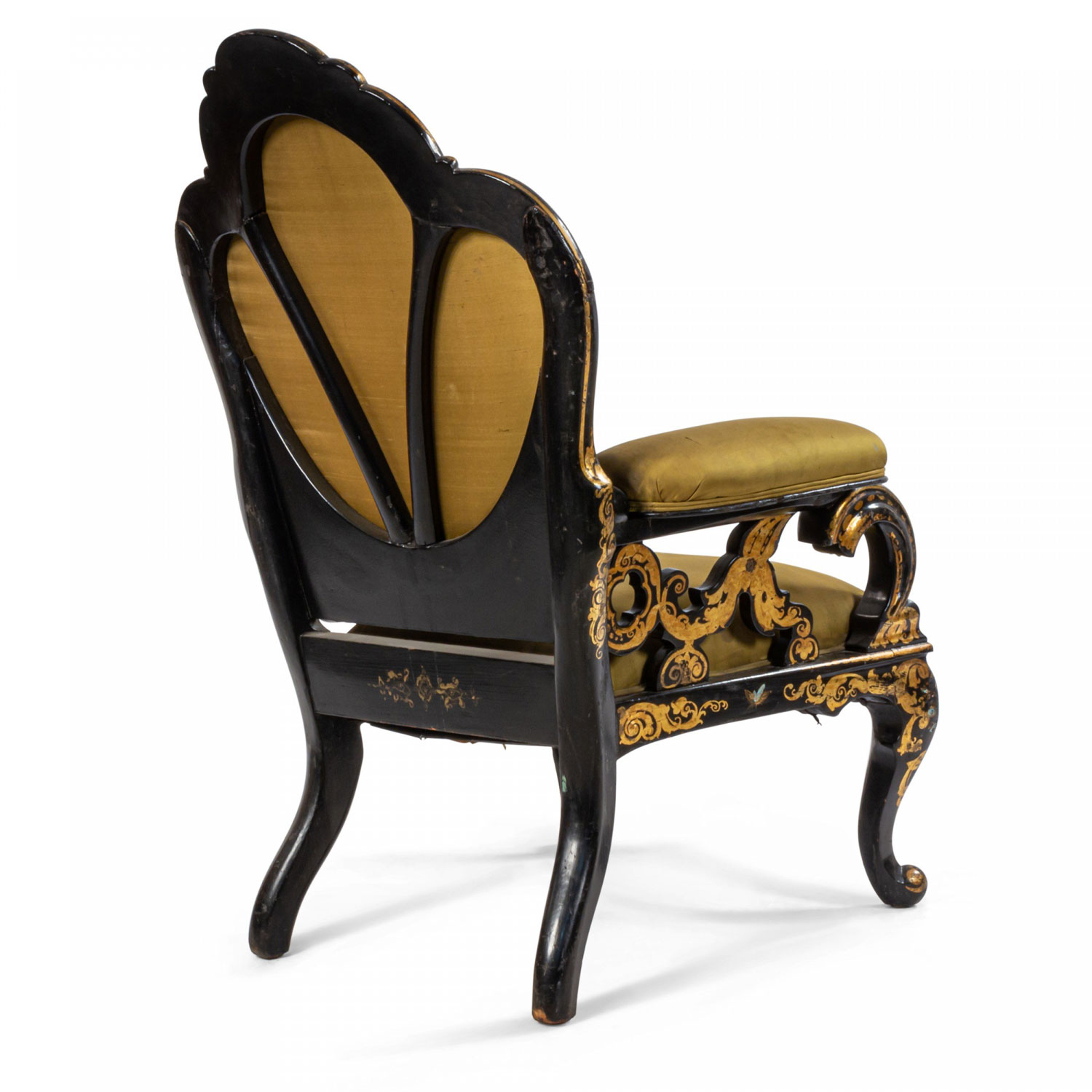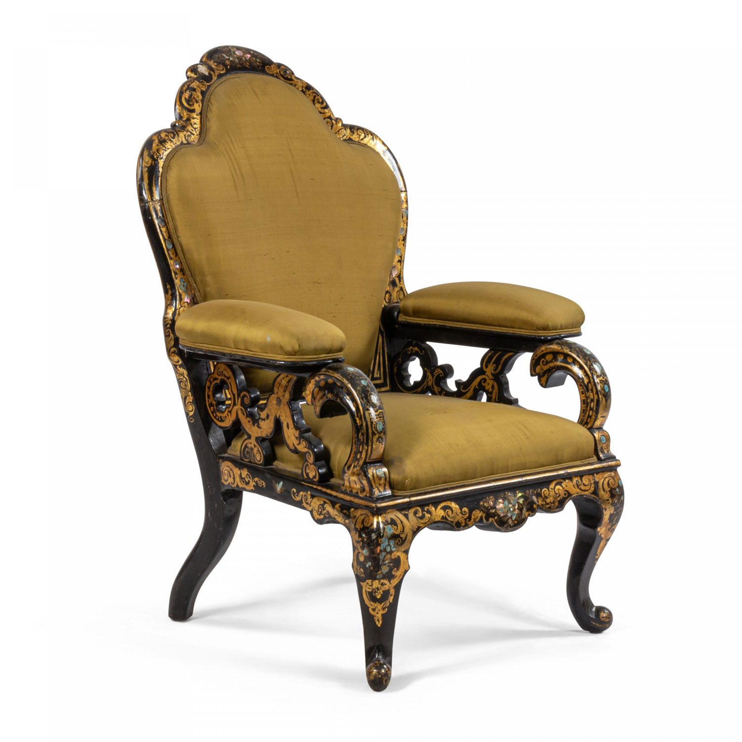 English Victorian black lacquered papier-mache armchair with pearl inlay, gold stenciled design, scalloped back, open work design arms, and green satin upholstery.