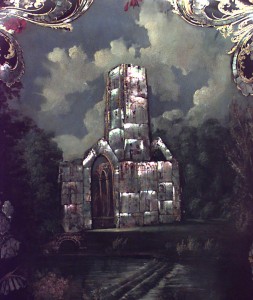 English Victorian Papier mache pearl inlaid black lacquered bergere arm chair with slip seat and decorated building scene with arches.