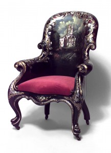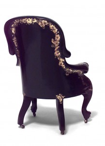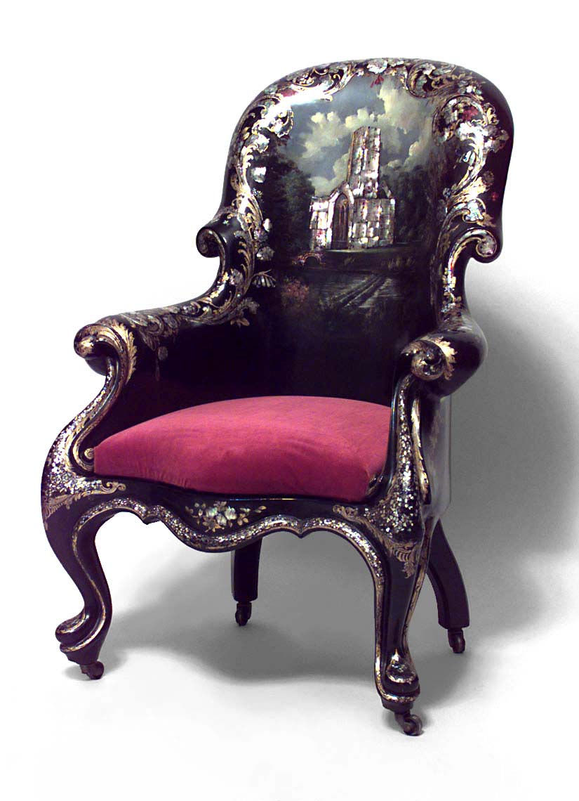 Style: English Materials & Techniques: Pearl, lacquered, arch, inlaid Category: Seating Condition: Minor stains to fabric.