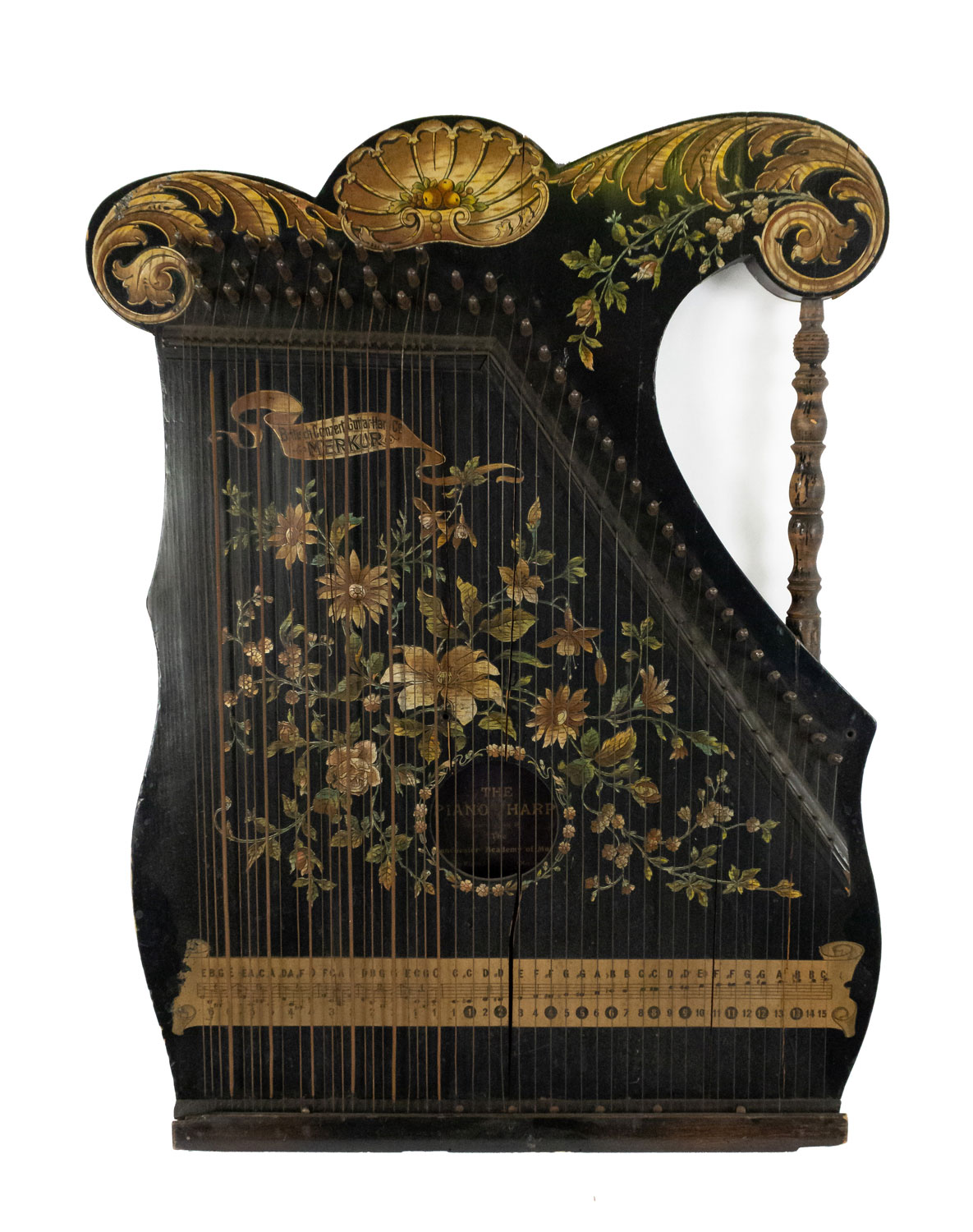 English Victorian black lacquered zither with gold floral stenciling and spindle handle (signed).