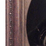 English Victorian gilt framed oil painting portrait of 19th Century lady leaning on green pillow.