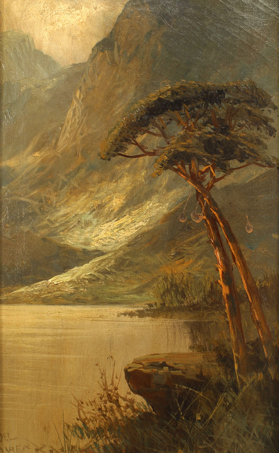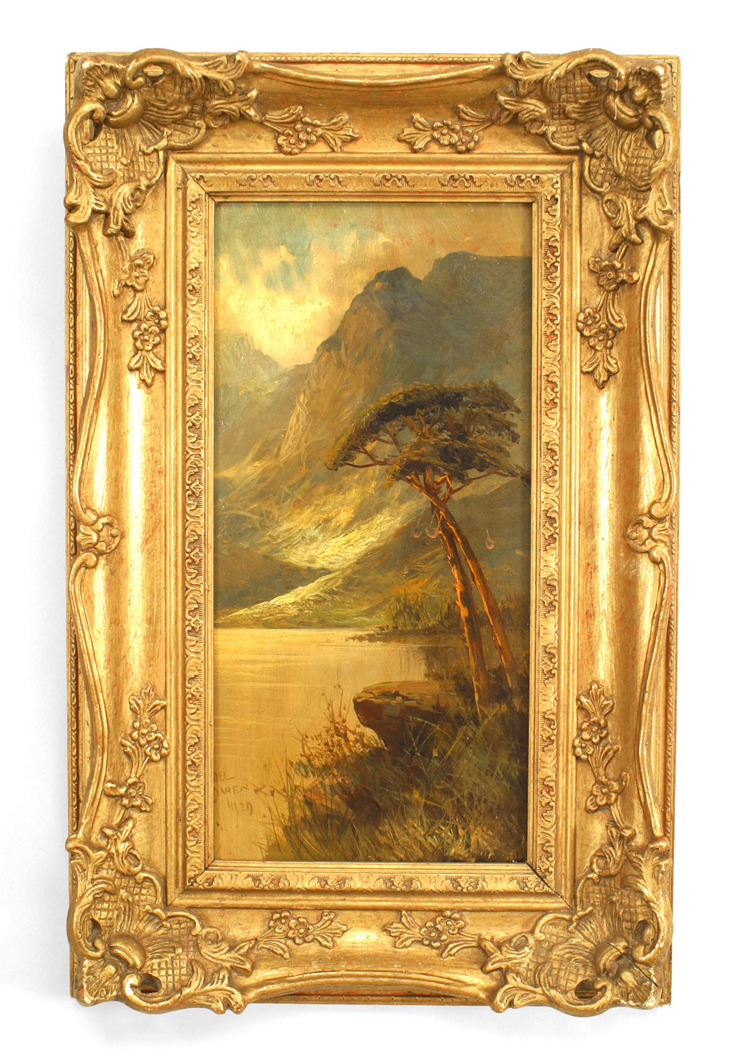 English Victorian style gilt framed vertical oil painting of a vertical landscape with mountain, lake, and 2 trees (signed)