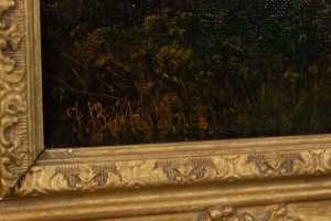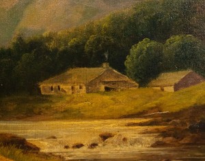 English Victorian style gilt framed oil painting of a landscape with cows on trail by river and houses (similar to 053574)