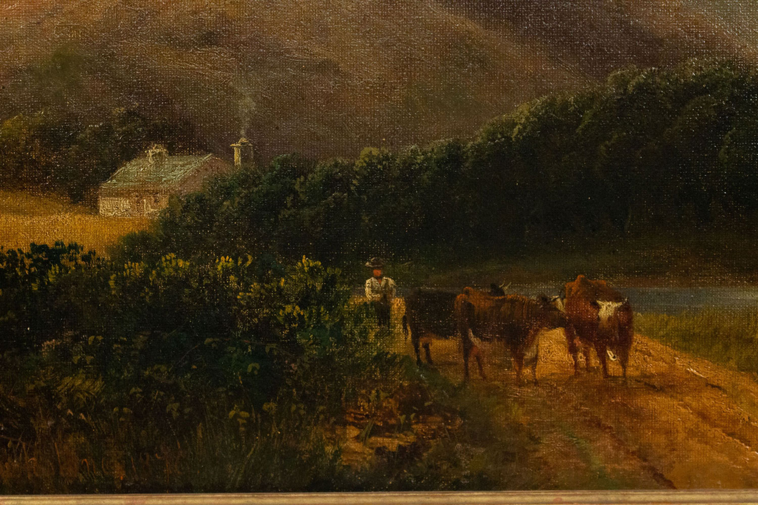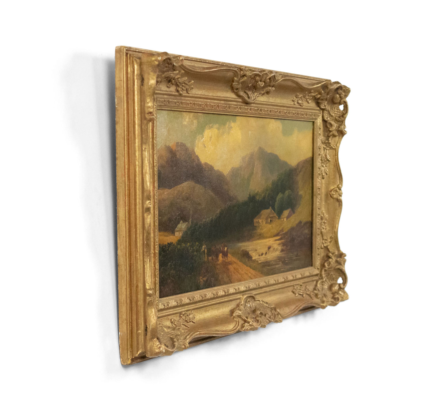 English Victorian style gilt framed oil painting of a landscape with cows on trail by river and houses (similar to 053574).