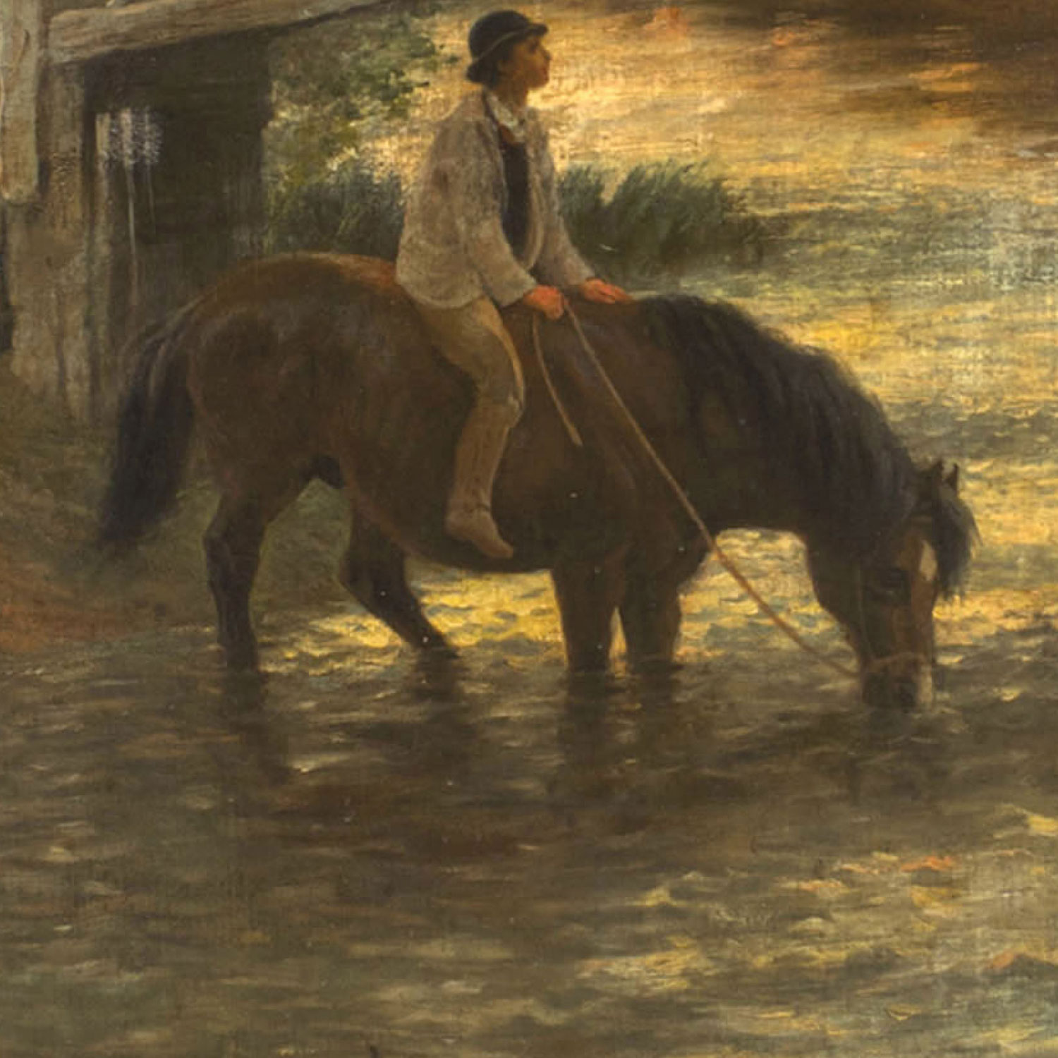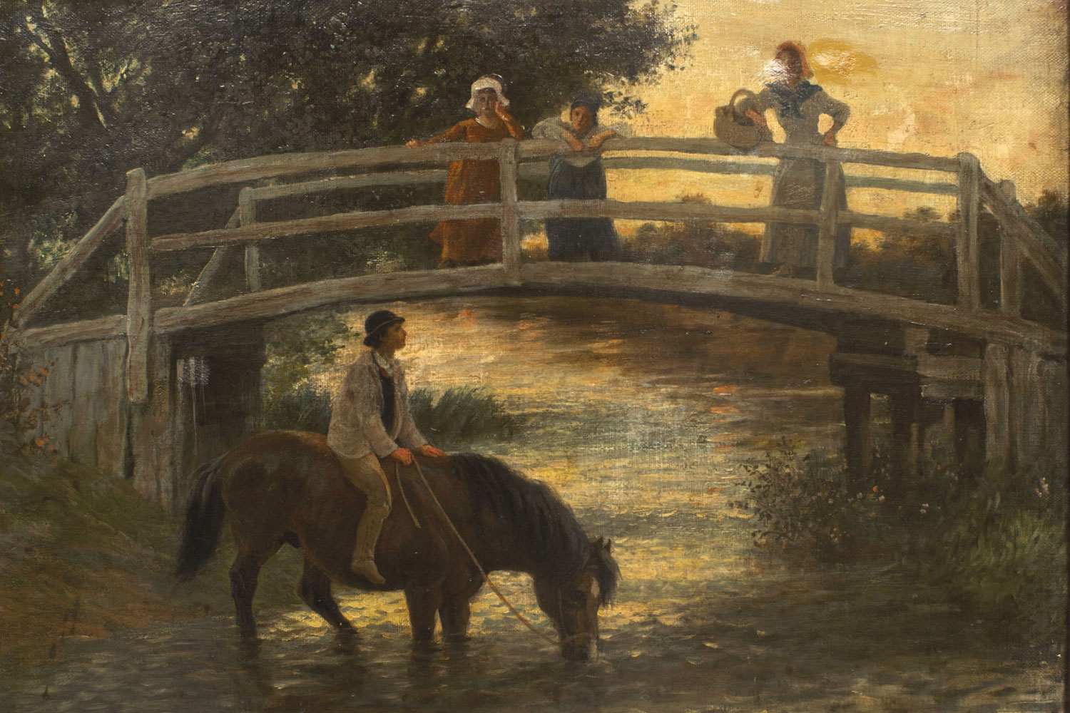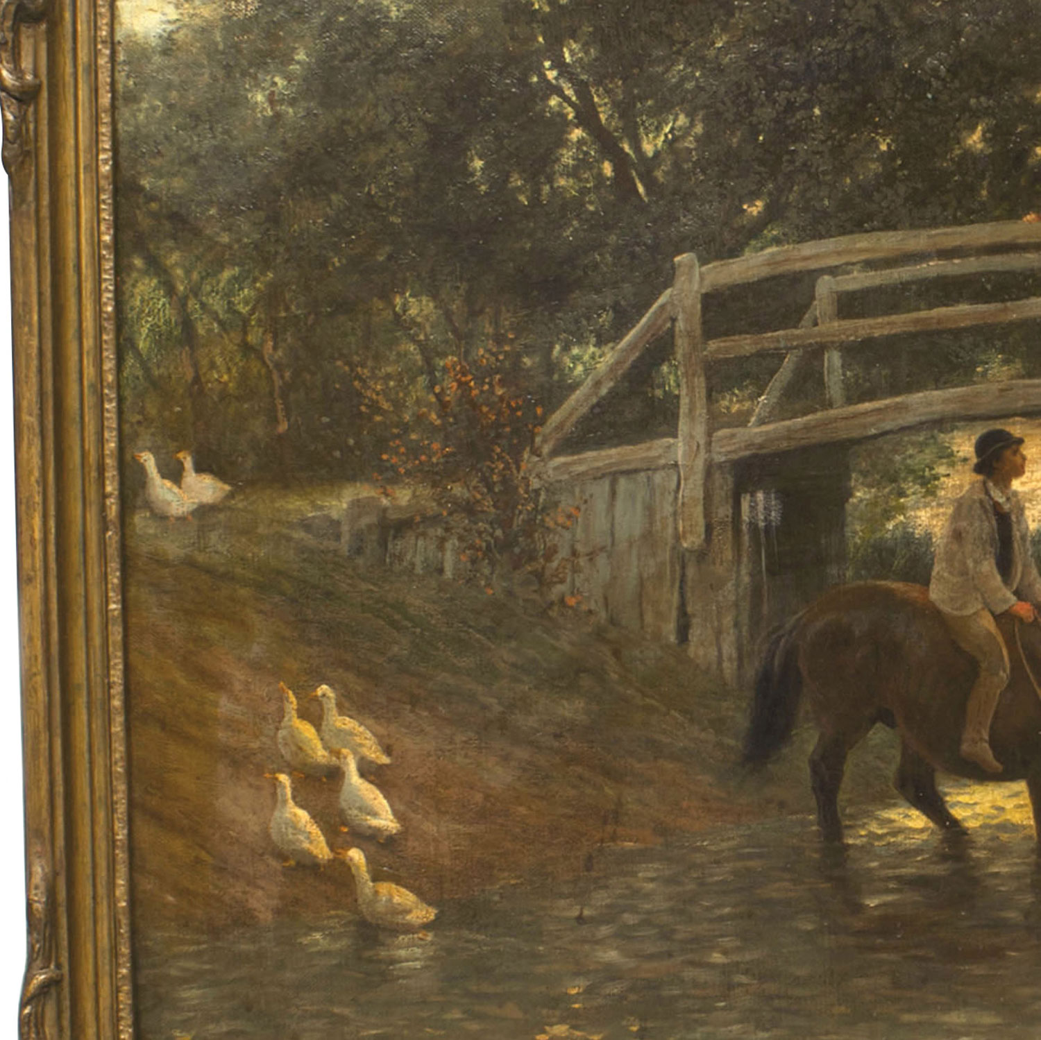 English Victorian gilt framed oil landscape painting of man on horse by bridge with 3 girls (Morris).