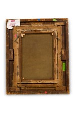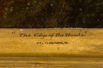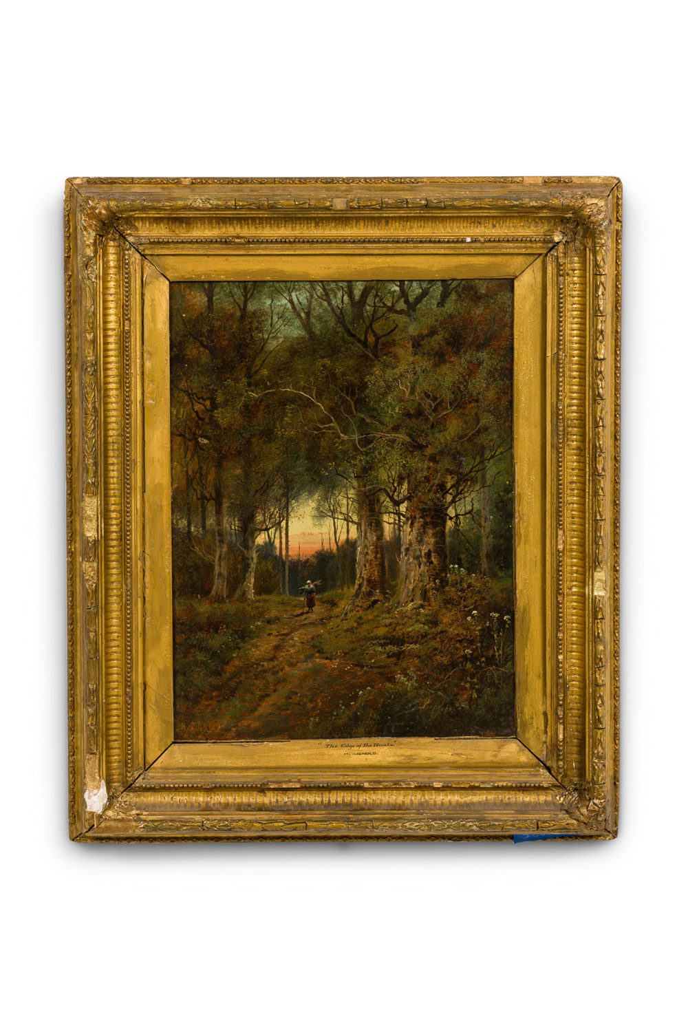 English Victorian gilt framed oil painting of lady in vertical forest landscape with sticks on back (H. Reynold).