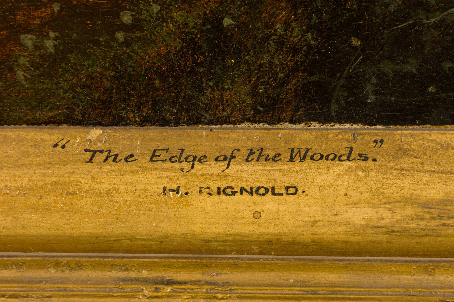 English Victorian gilt framed oil painting of lady in vertical forest landscape with sticks on back (H. Reynold)