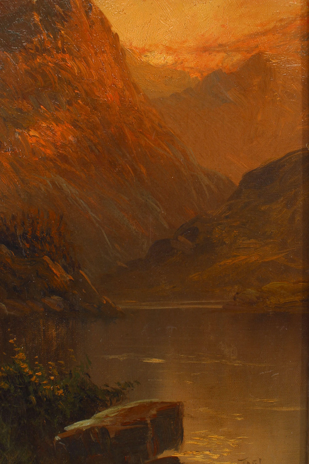 English Victorian style gilt framed vertical oil painting of a sunset landscape with mountains and lake. (signed)