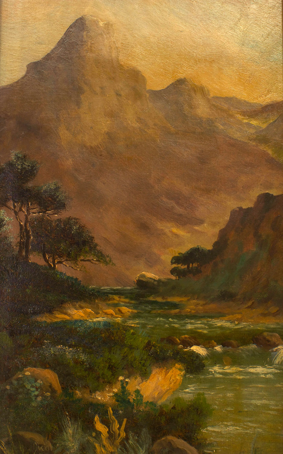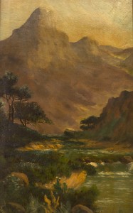 English Victorian style gilt framed oil painting of a vertical landscape with mountains and stream (similar to 053578)