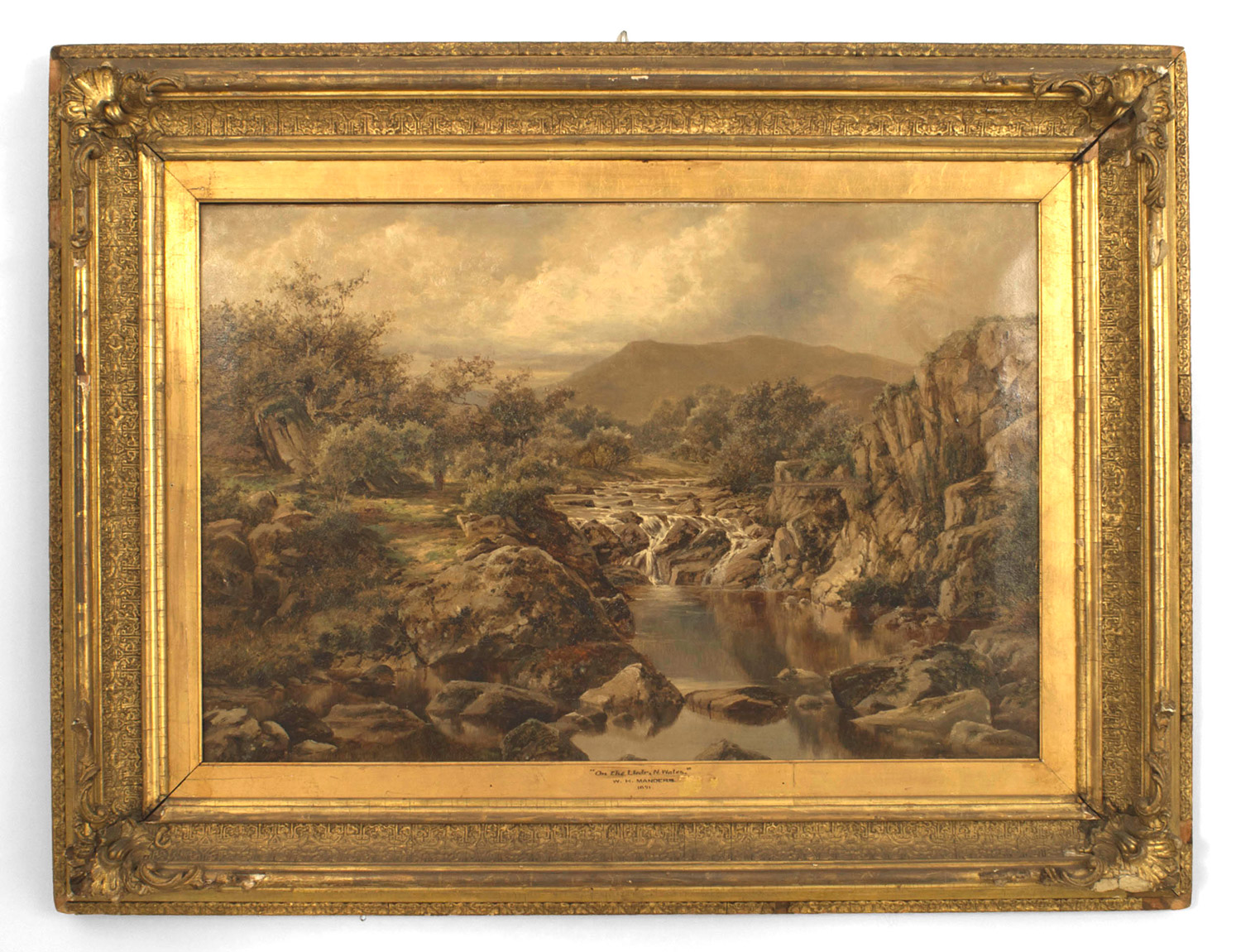 English Victorian gilt framed oil landscape painting of stream and mountains (Manders)