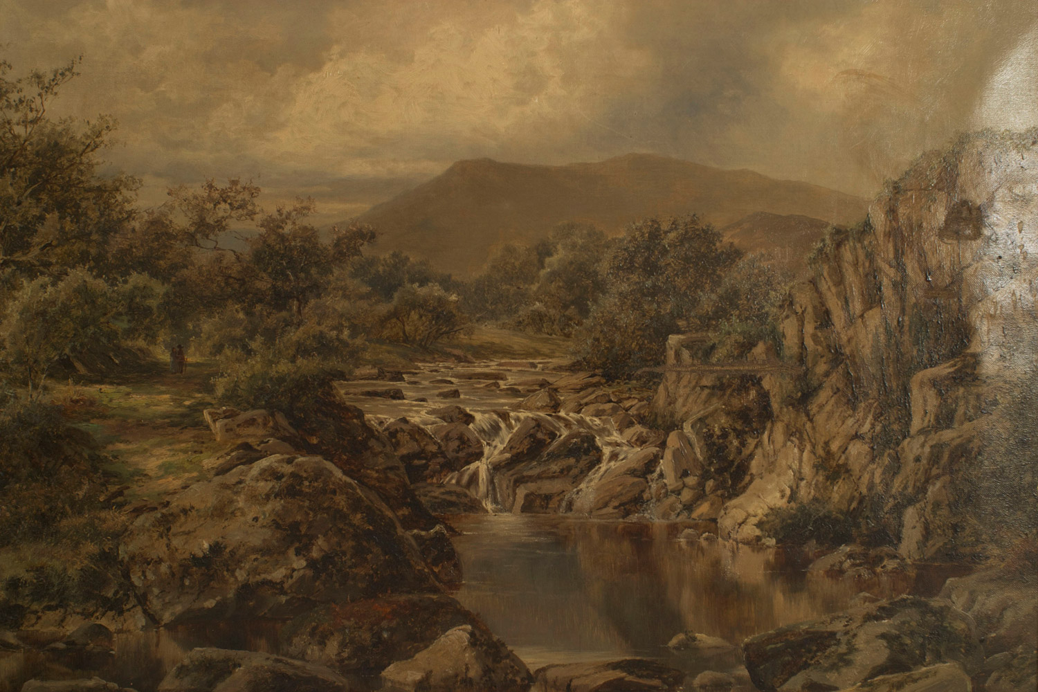 English Victorian gilt framed oil landscape painting of stream and mountains (Manders).