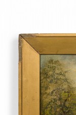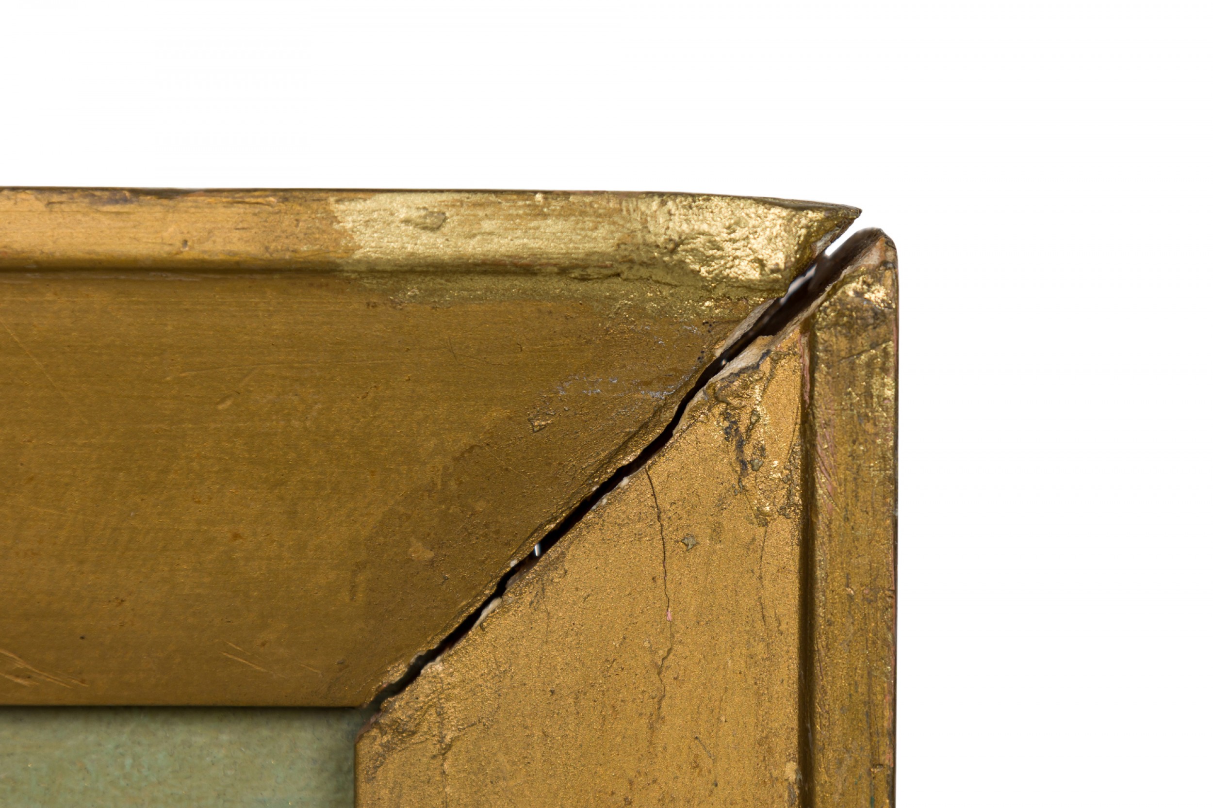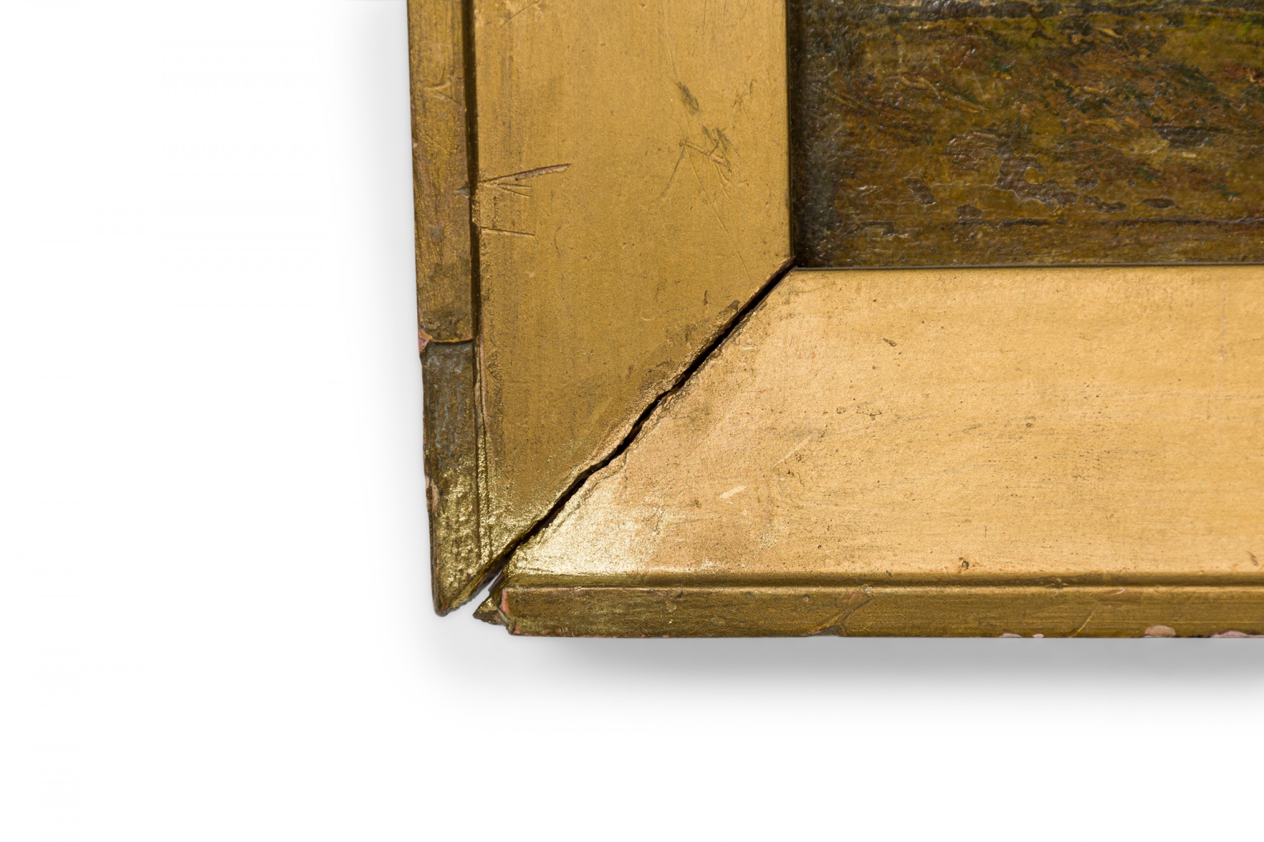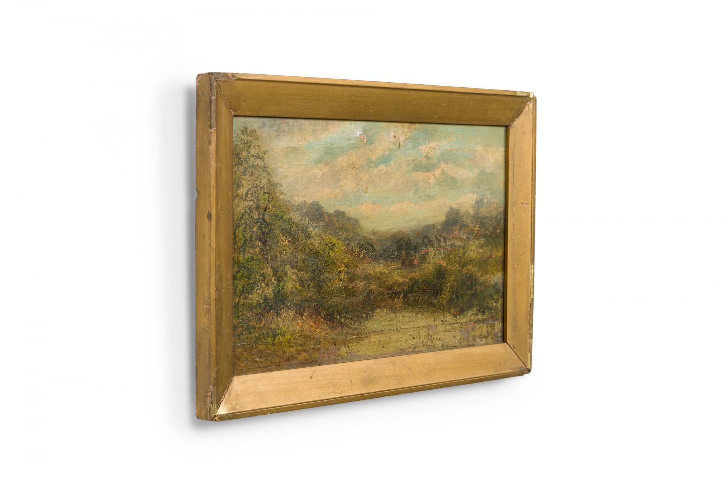 English Victorian simple gilt framed oil landscape painting with 3 figures in background.