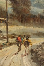 American Mid-Century Impressionist style winter landscape painting of a man and horse walking down a snowy path by a telephone pole towards a house in a gold frame (signed: GIORDANO).