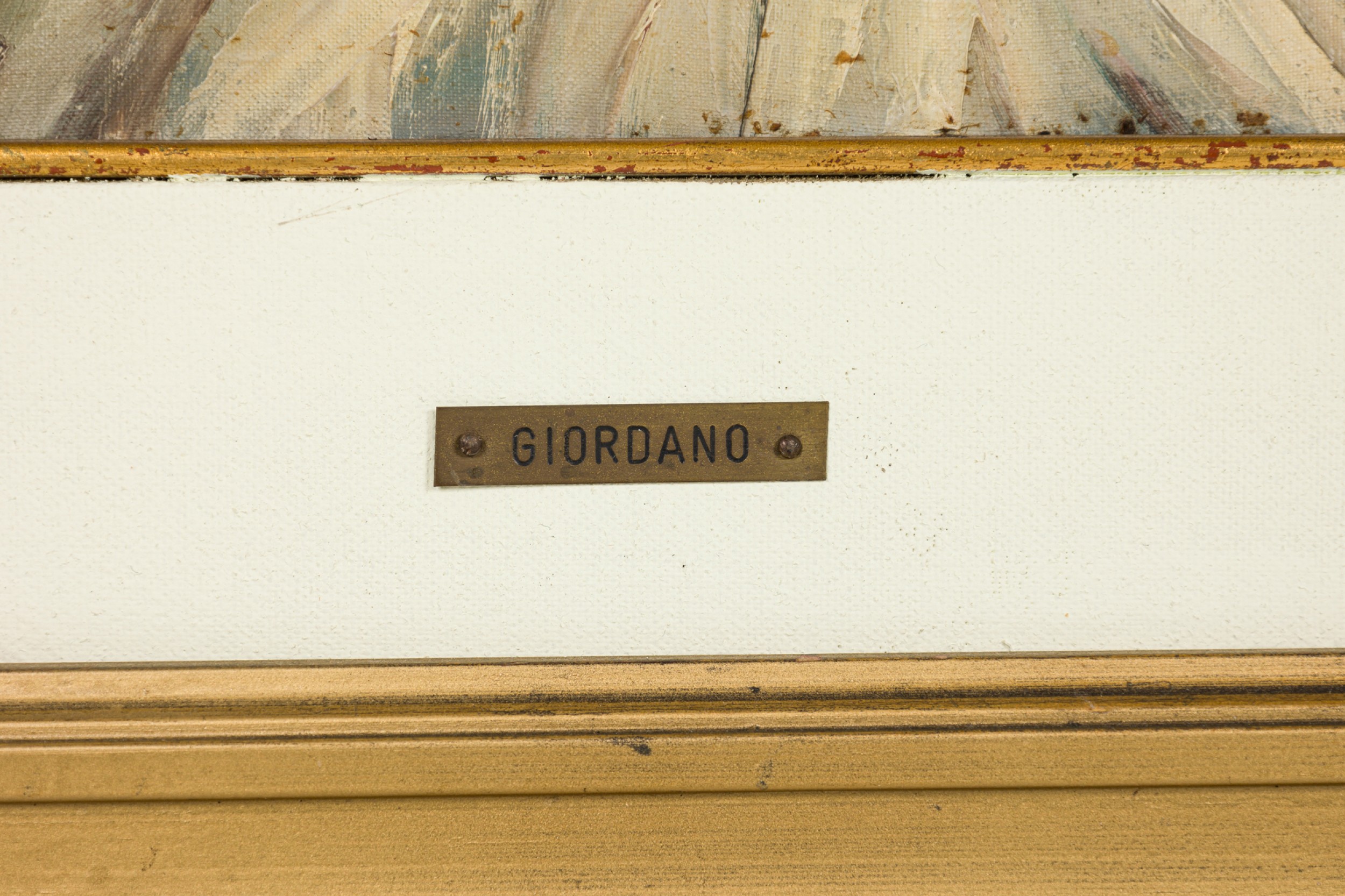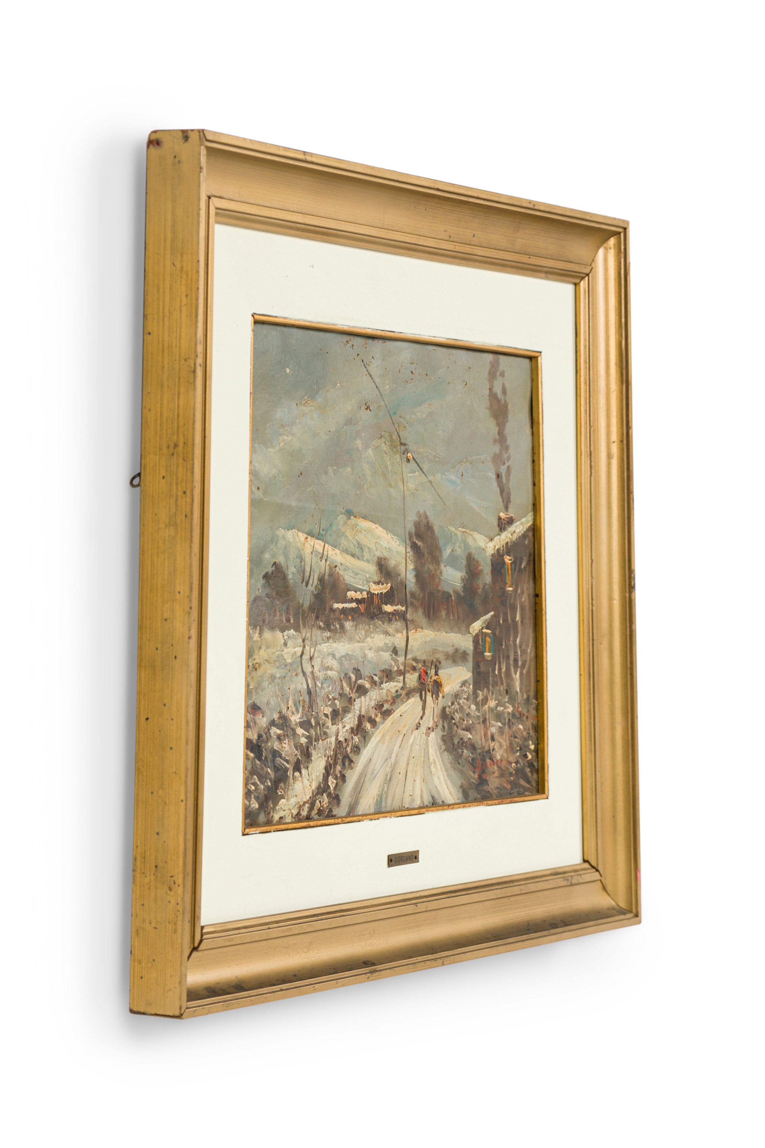 American Mid-Century Impressionist style winter landscape painting of a man and horse walking down a snowy path by a telephone pole towards a house in a gold frame (signed: GIORDANO)