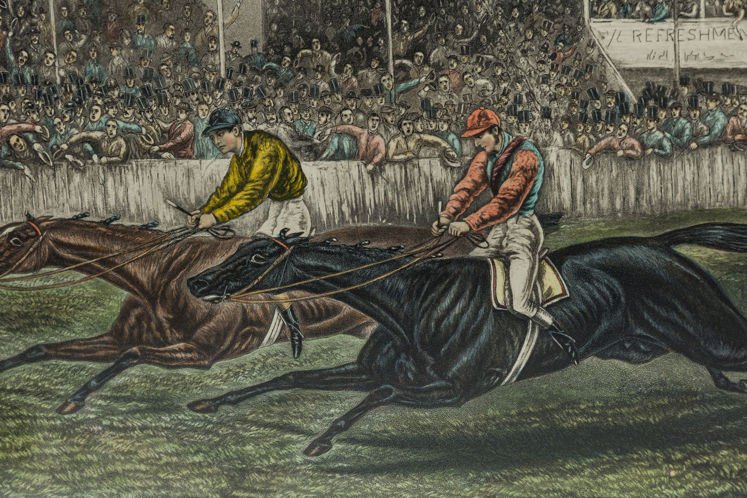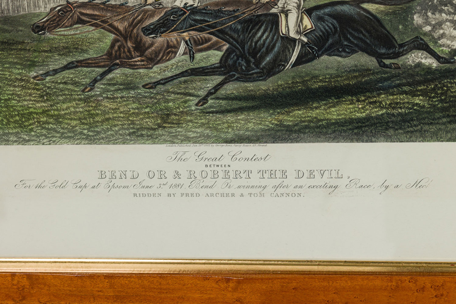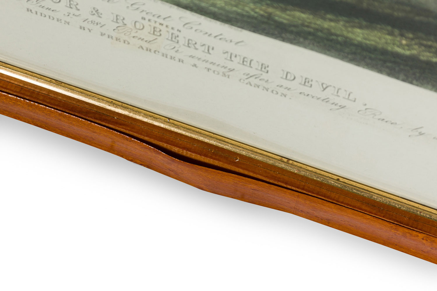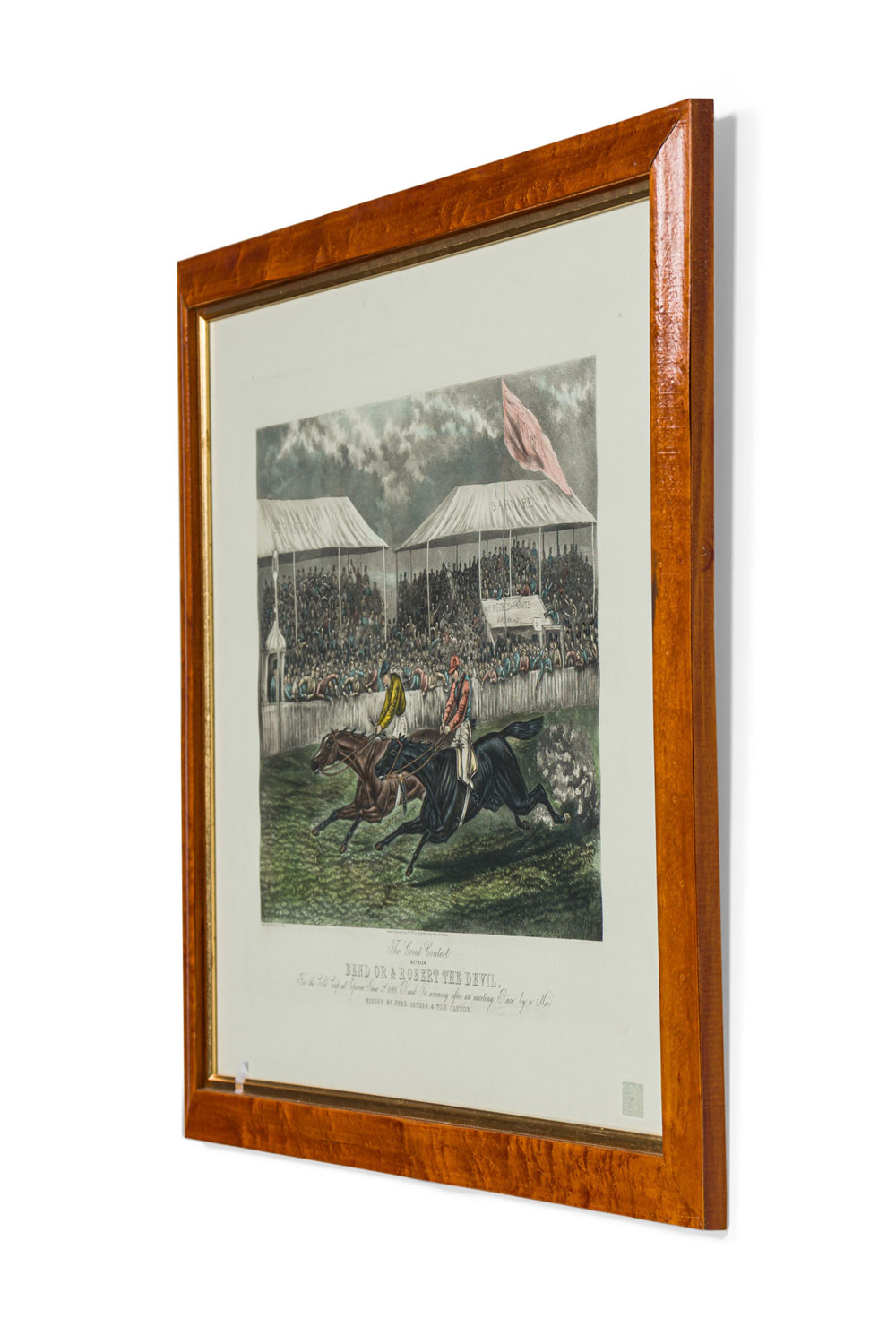 English Victorian Lithograph of an Equestrian Scene depicting two competing horses in a maple and gilt frame.
