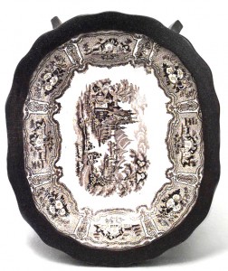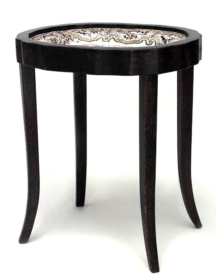 English Victorian mahogany end table with brown and white inset porcelain platter on mahogany base. (Base is new)