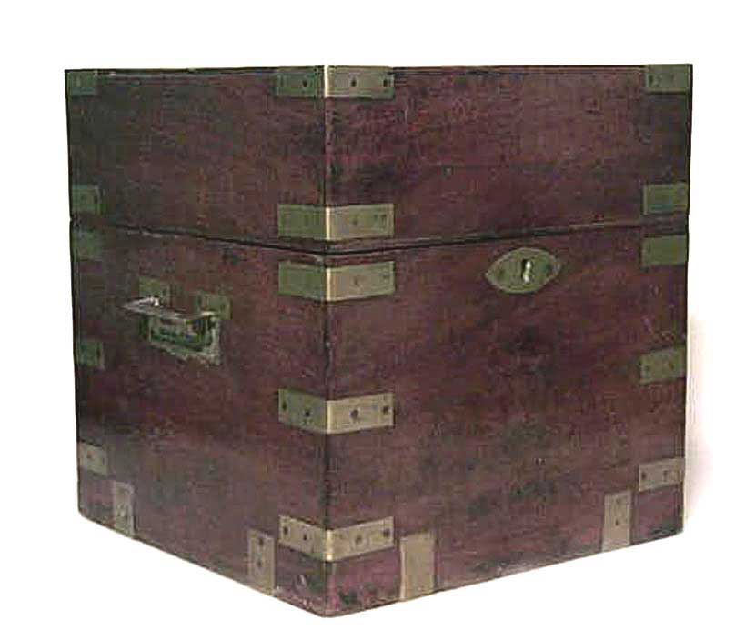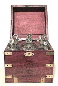 English Victorian mahogany and brass trimmed campaign style tantalus set case with 9 shaped crystal decanters..