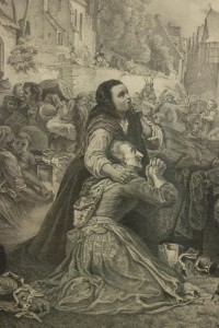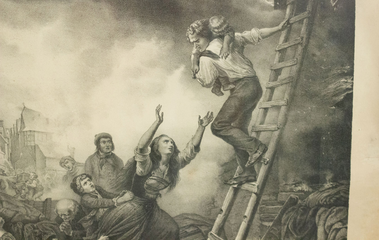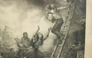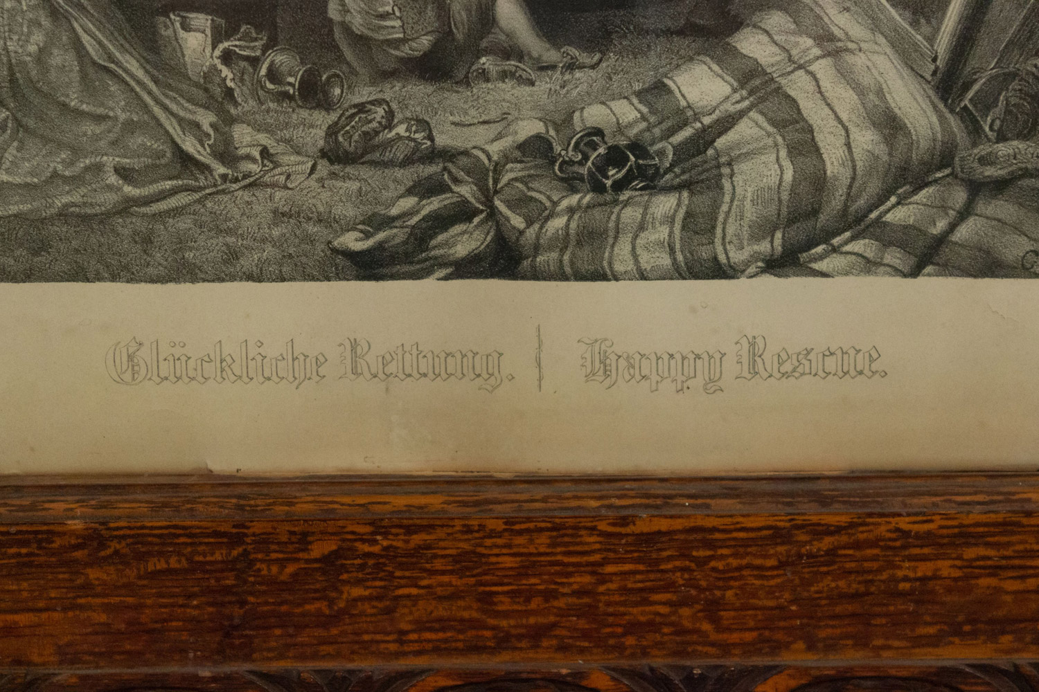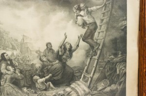 Carved oak framed print of 19th Cent man on ladder during a rescue.