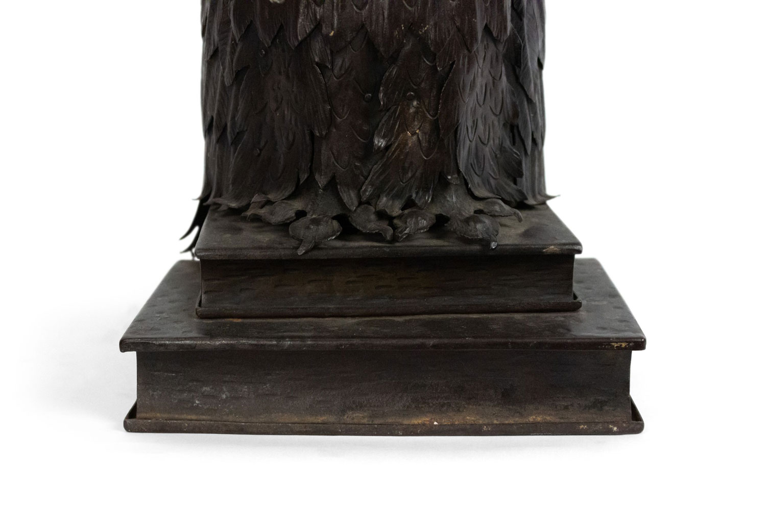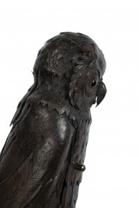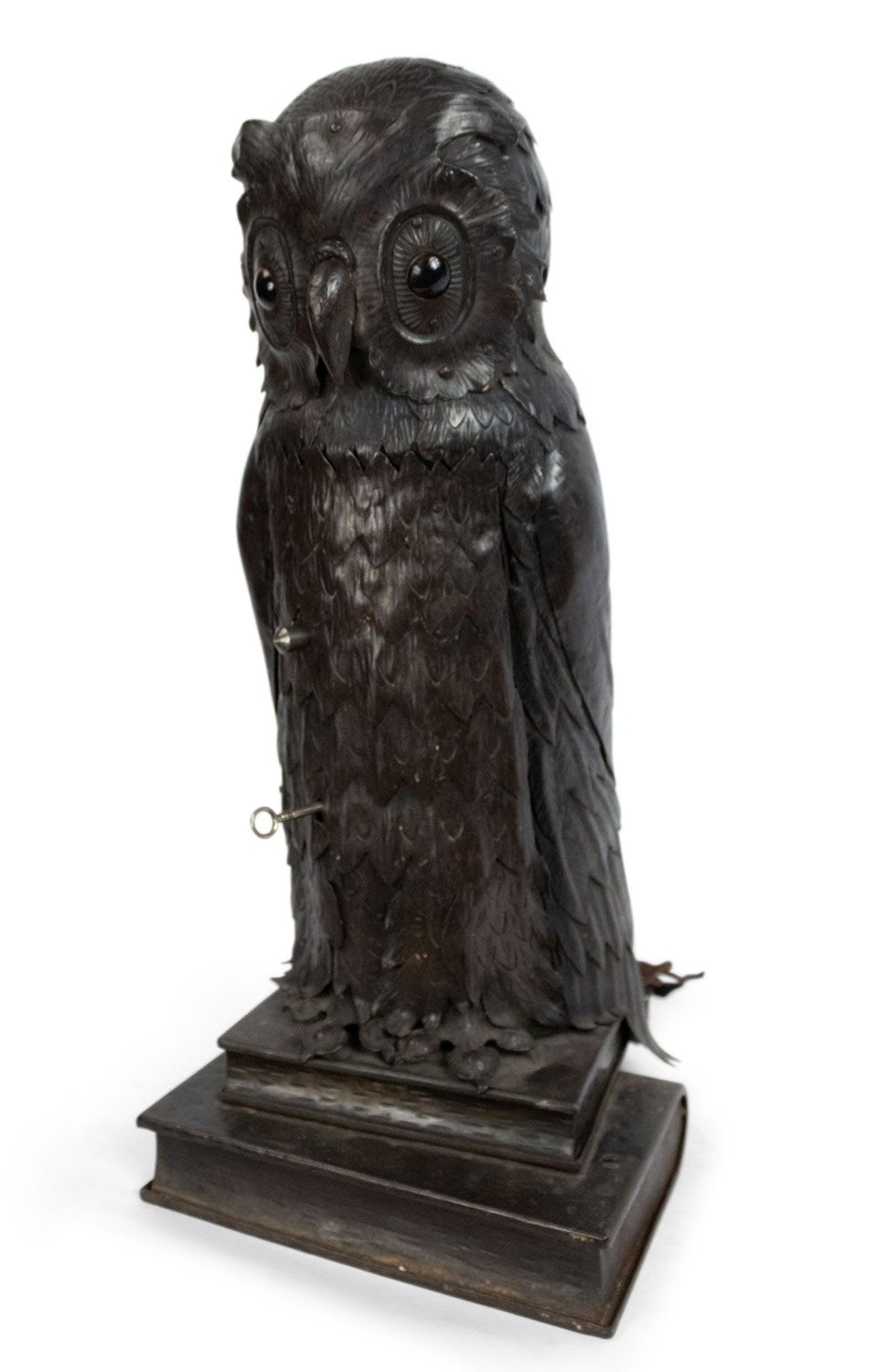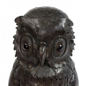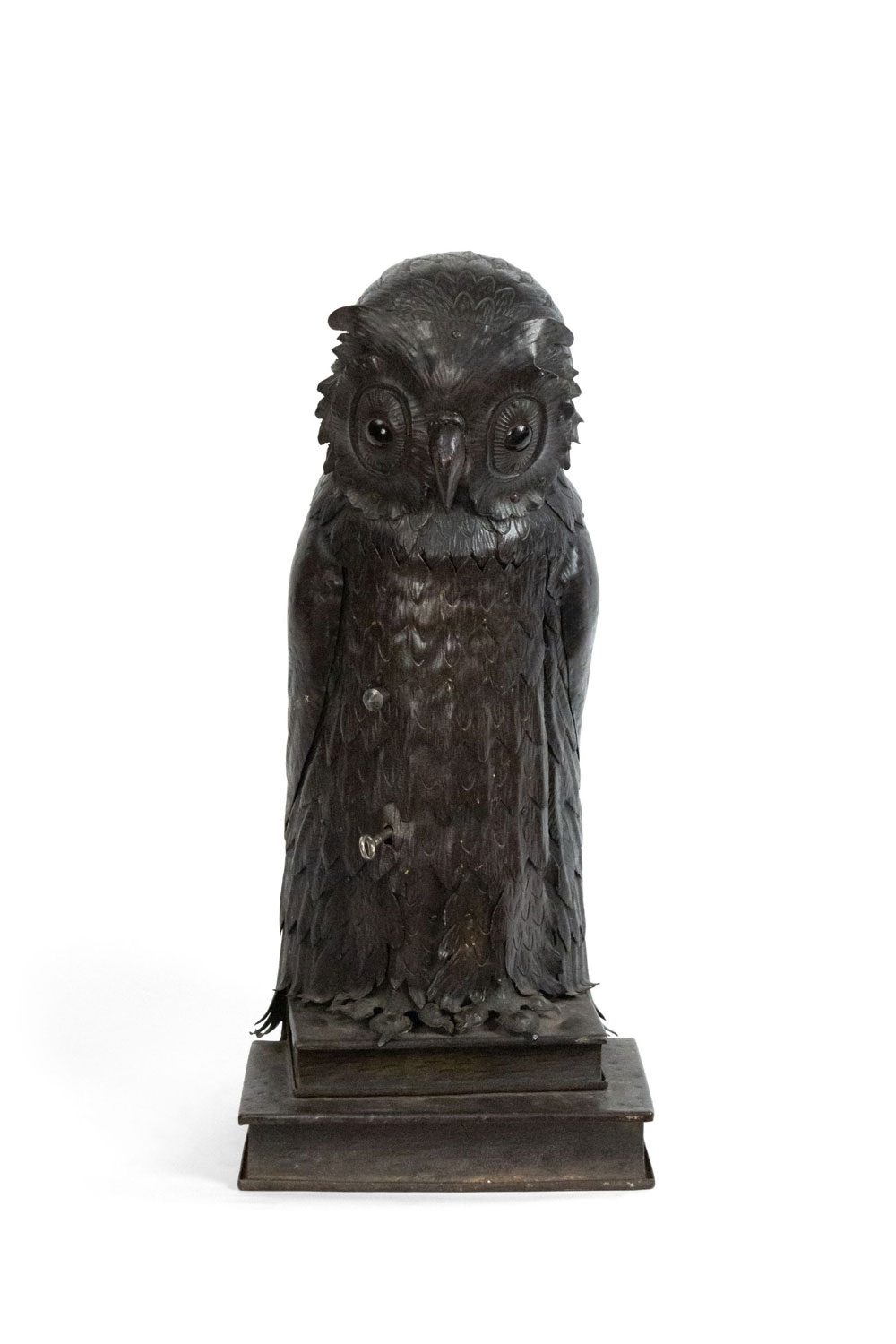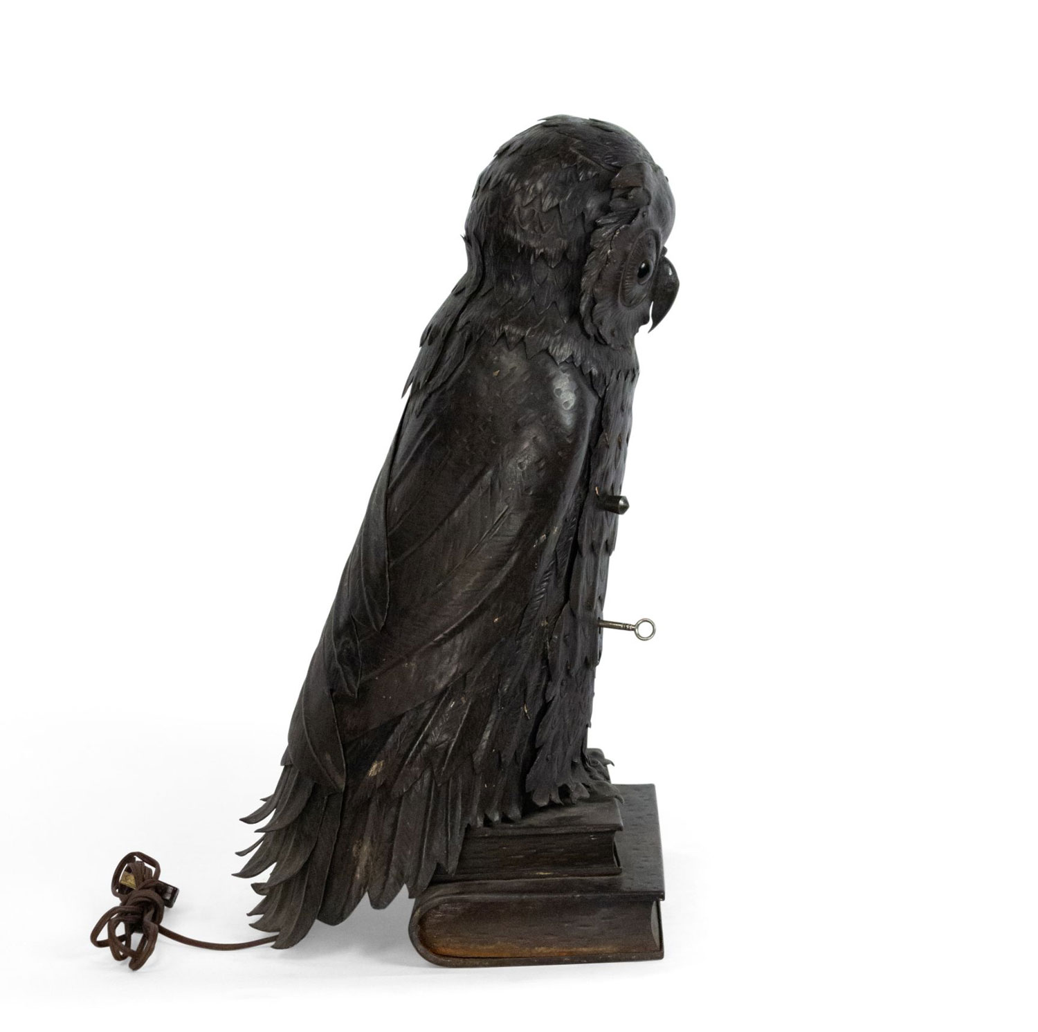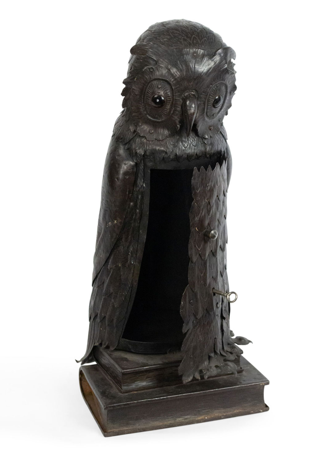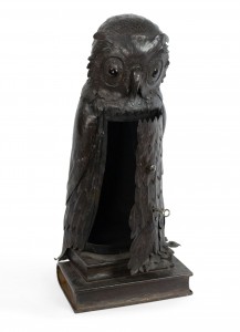 English Victorian metal table lamp of owl standing on 2 books with door in front.