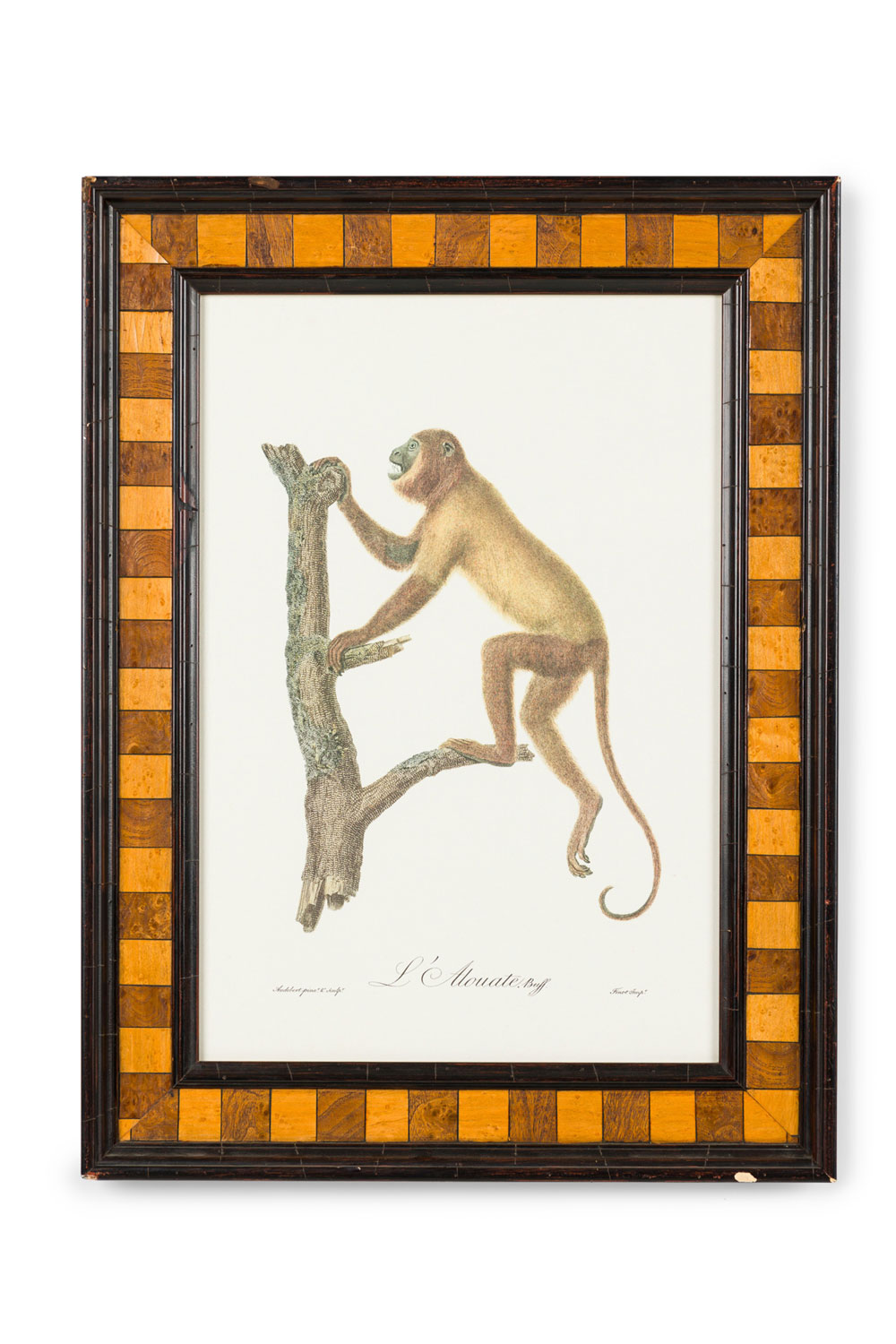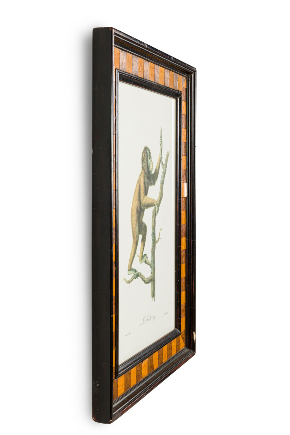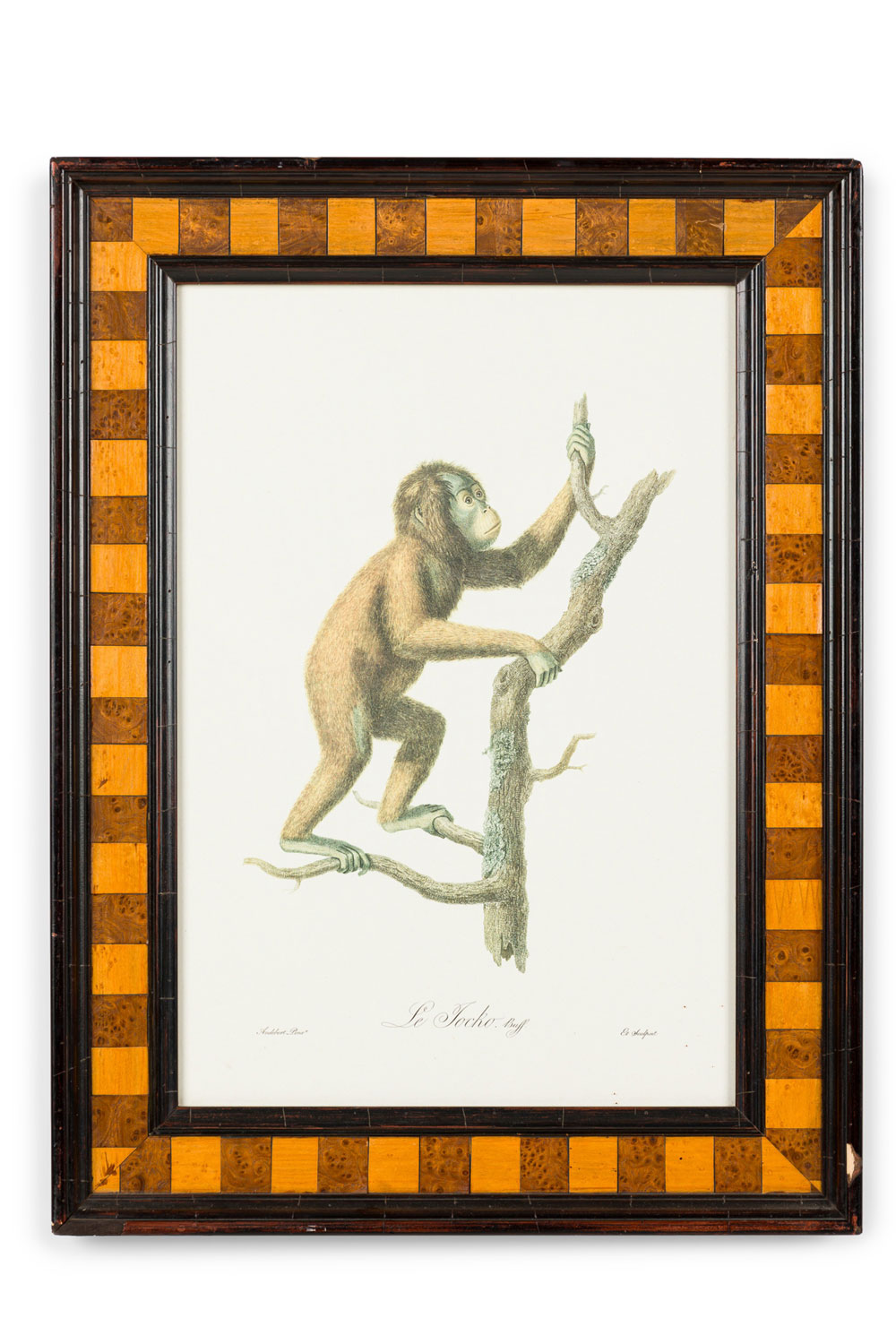 PAIR of English Victorian style prints of monkeys in maple and burled inlaid rectangular frame