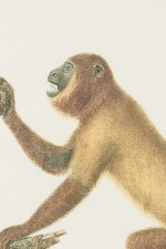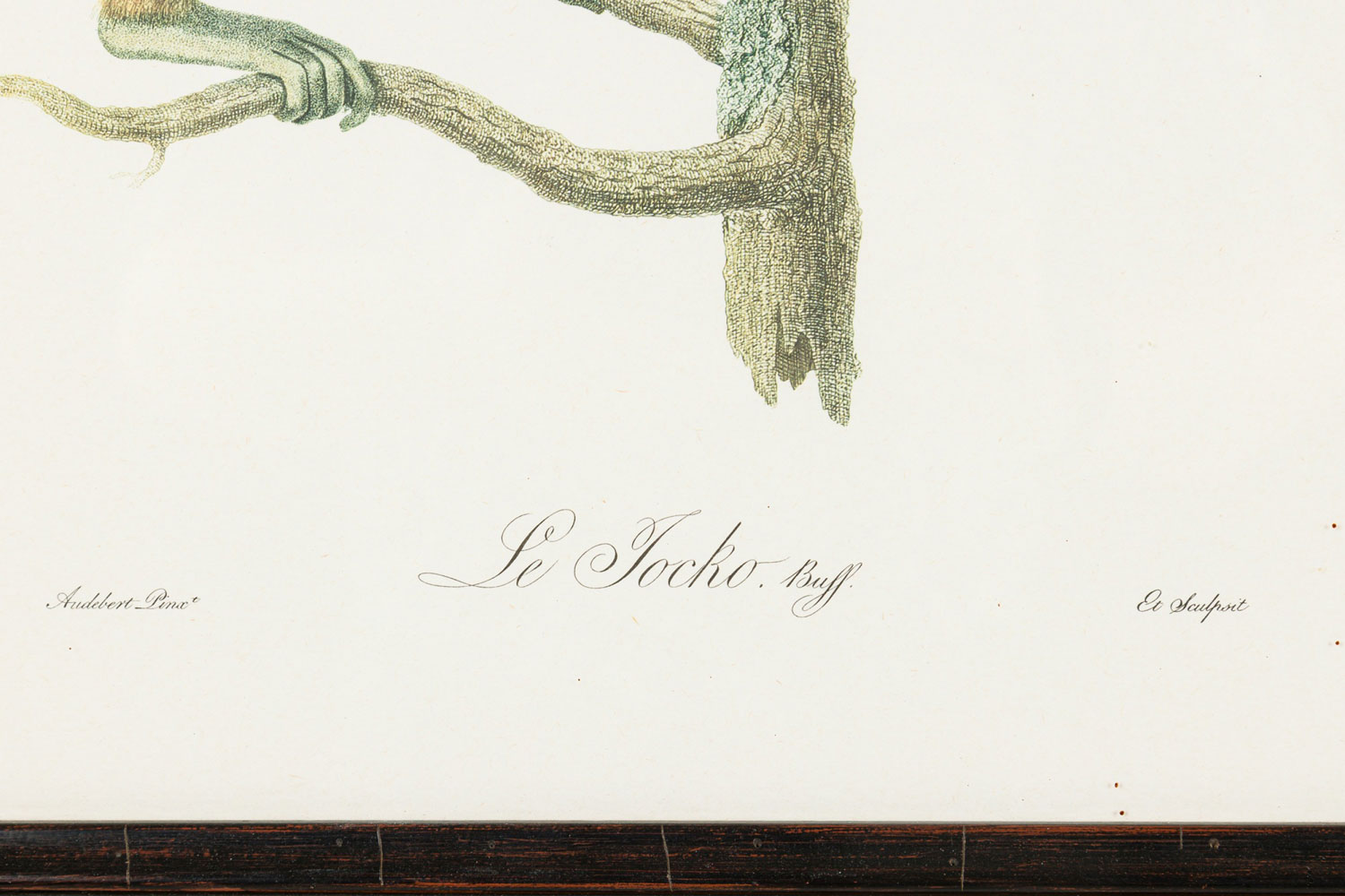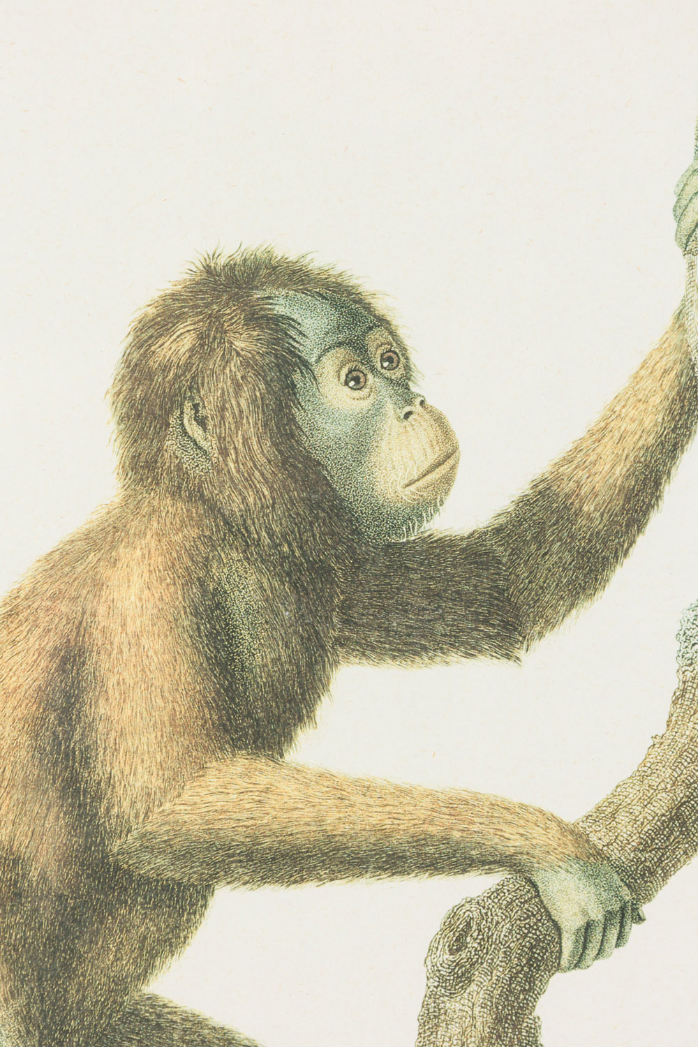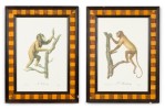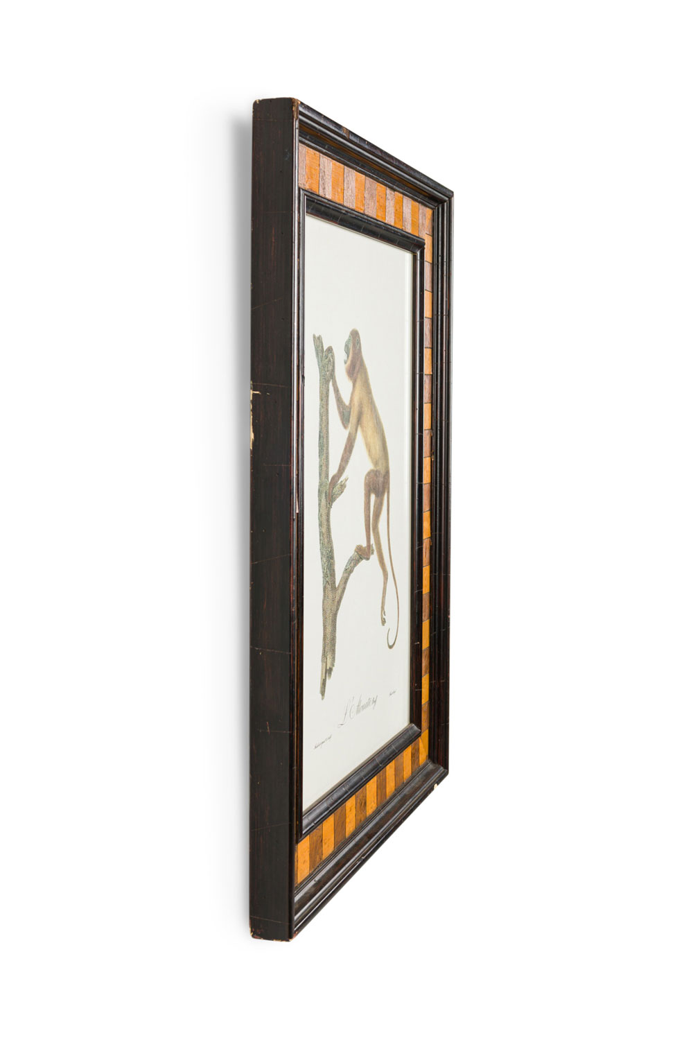 PAIR of English Victorian style prints of monkeys in maple and burled inlaid rectangular frame