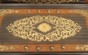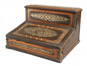 English Victorian oak and walnut trim lap desk box with nail head and brass filigree design..
