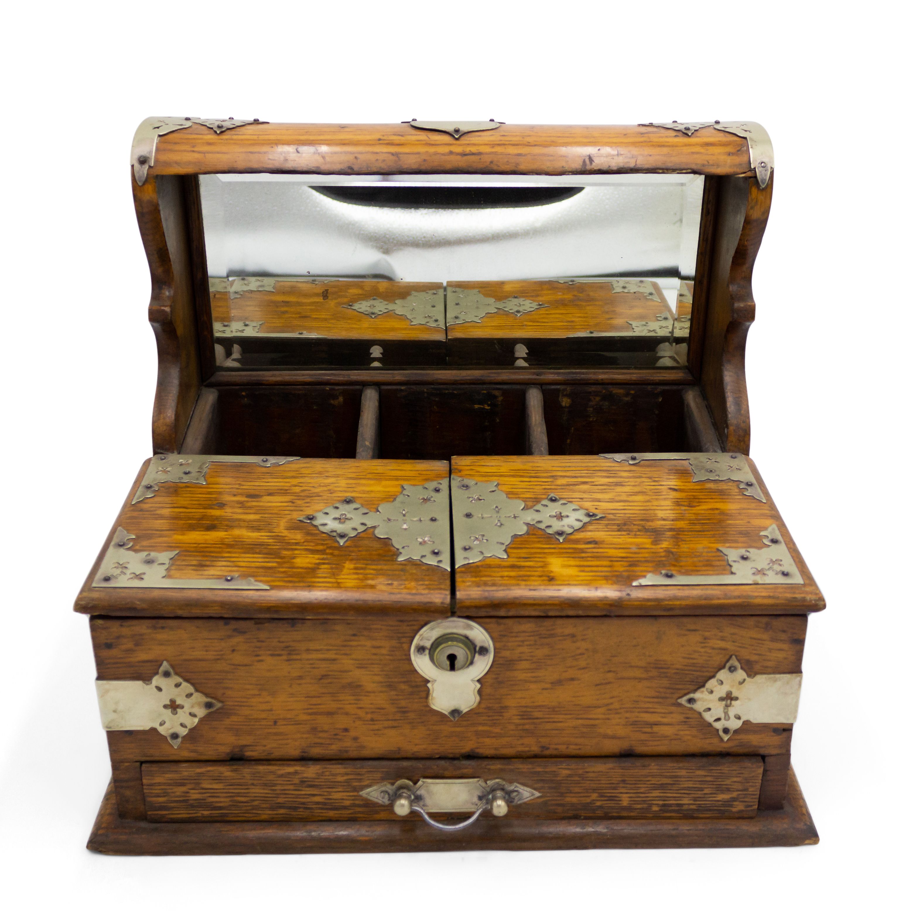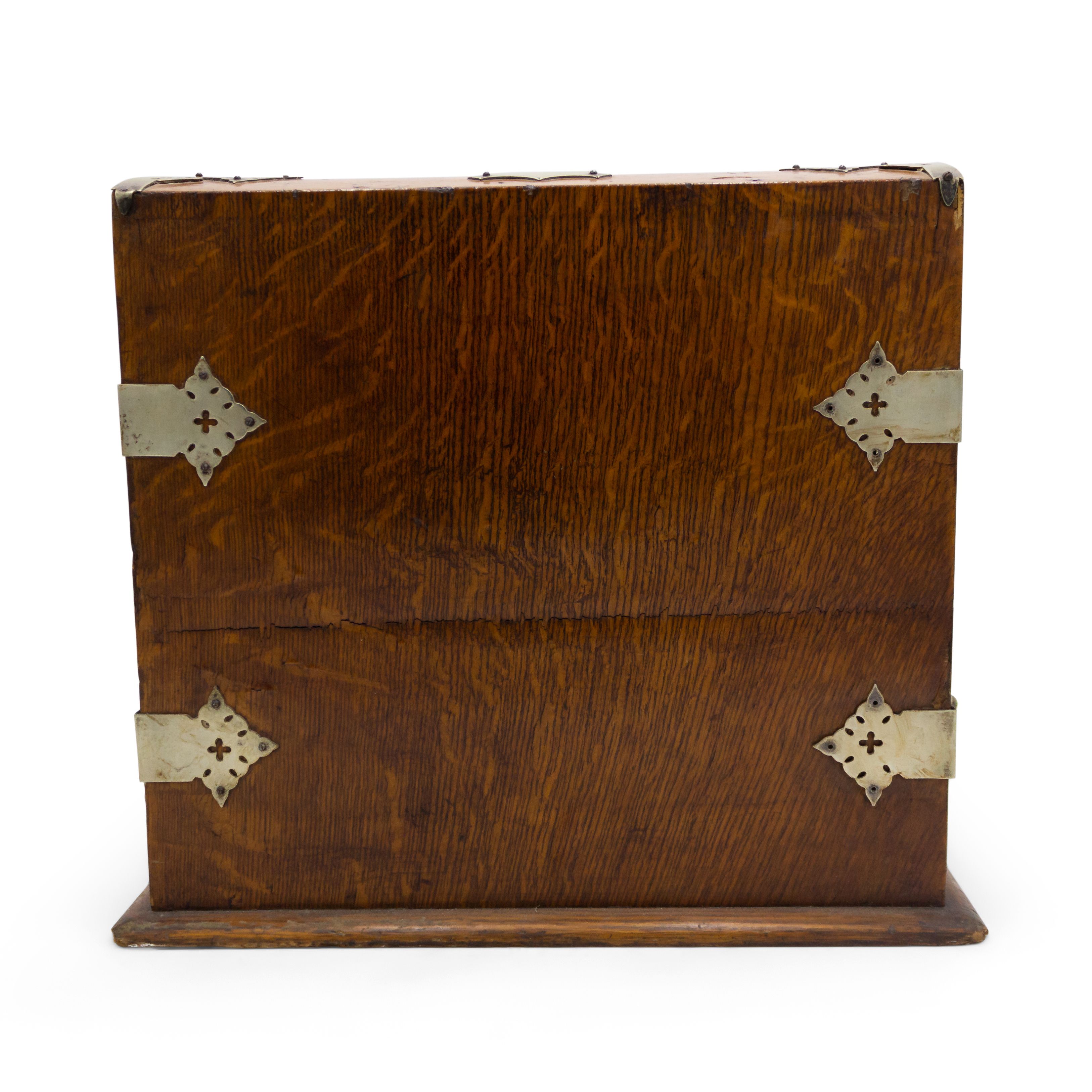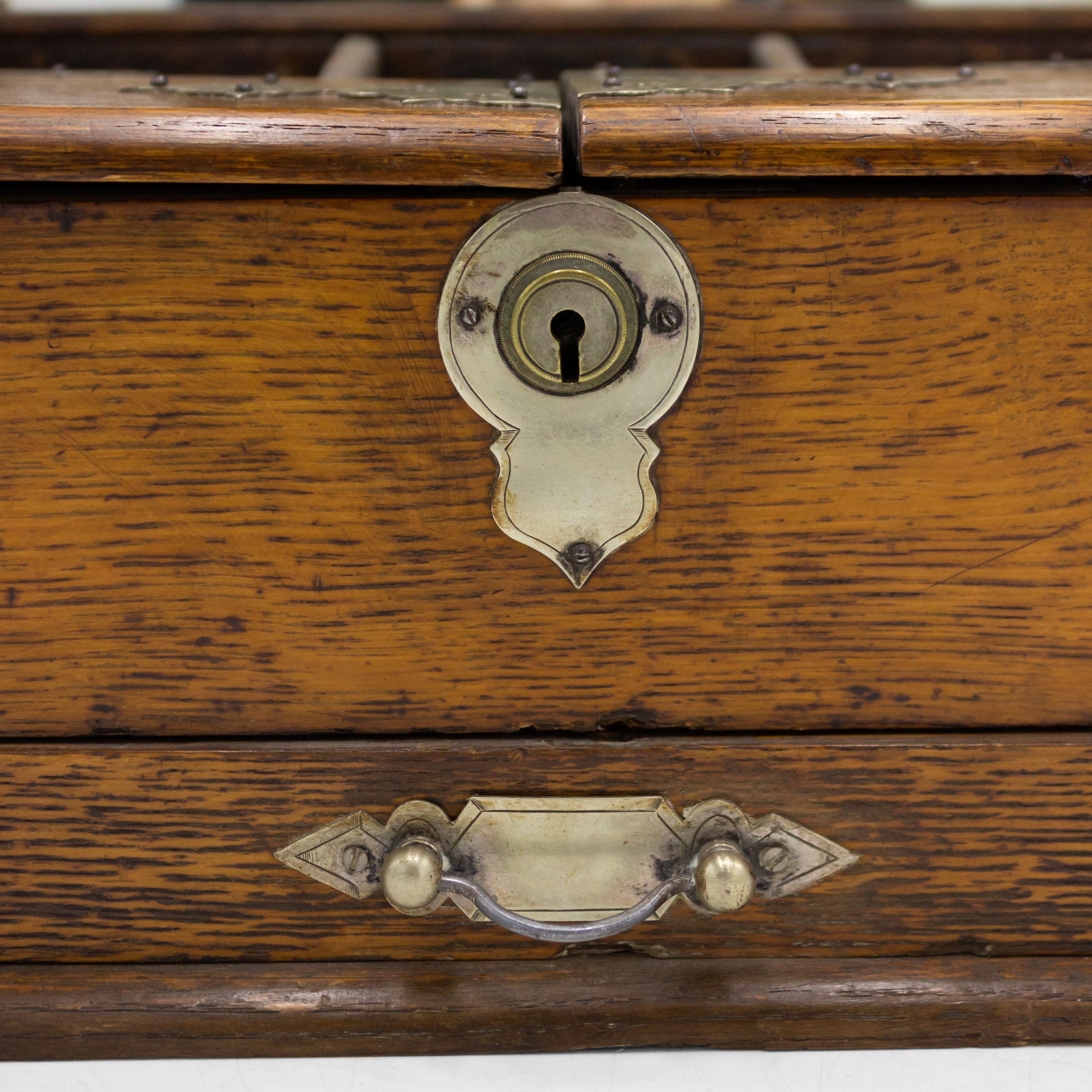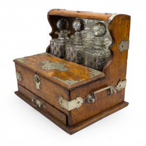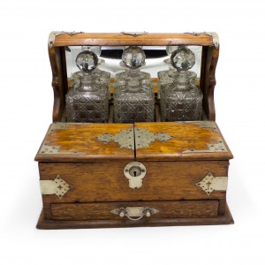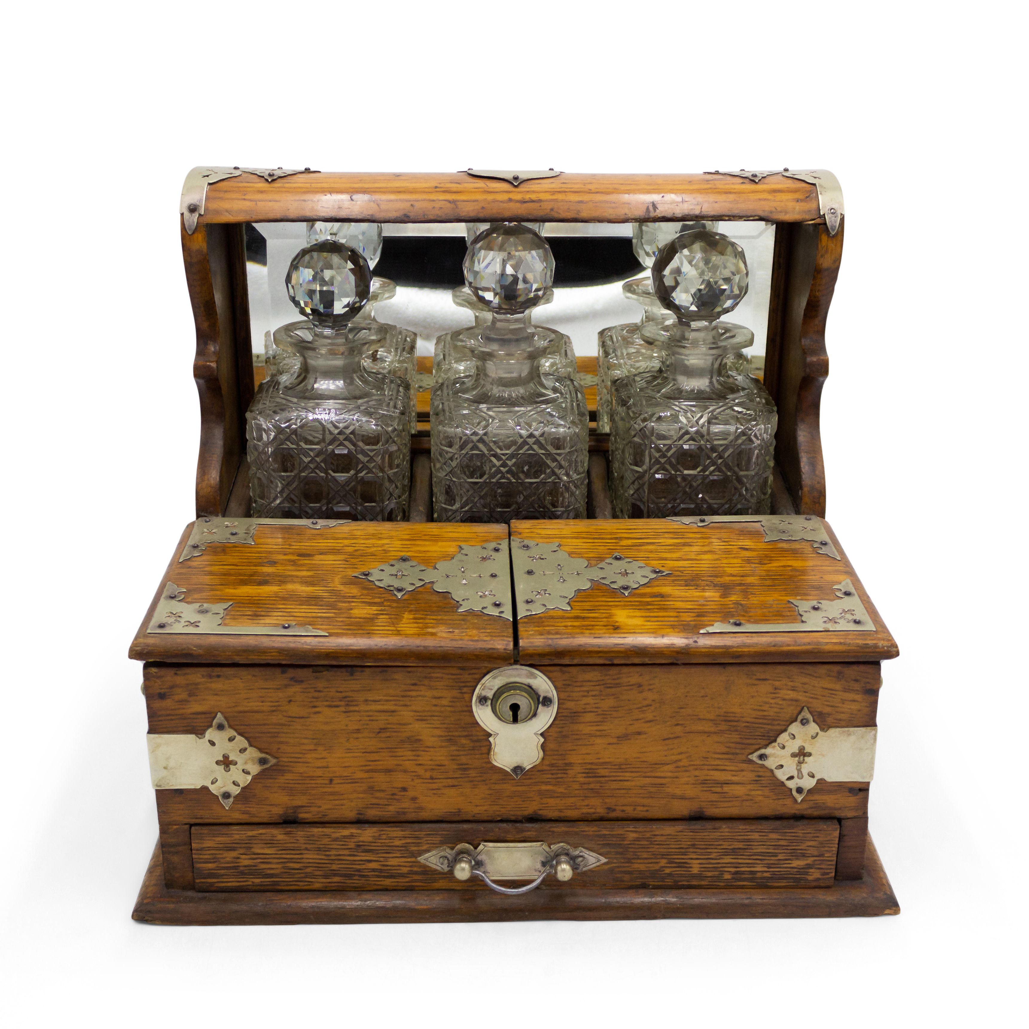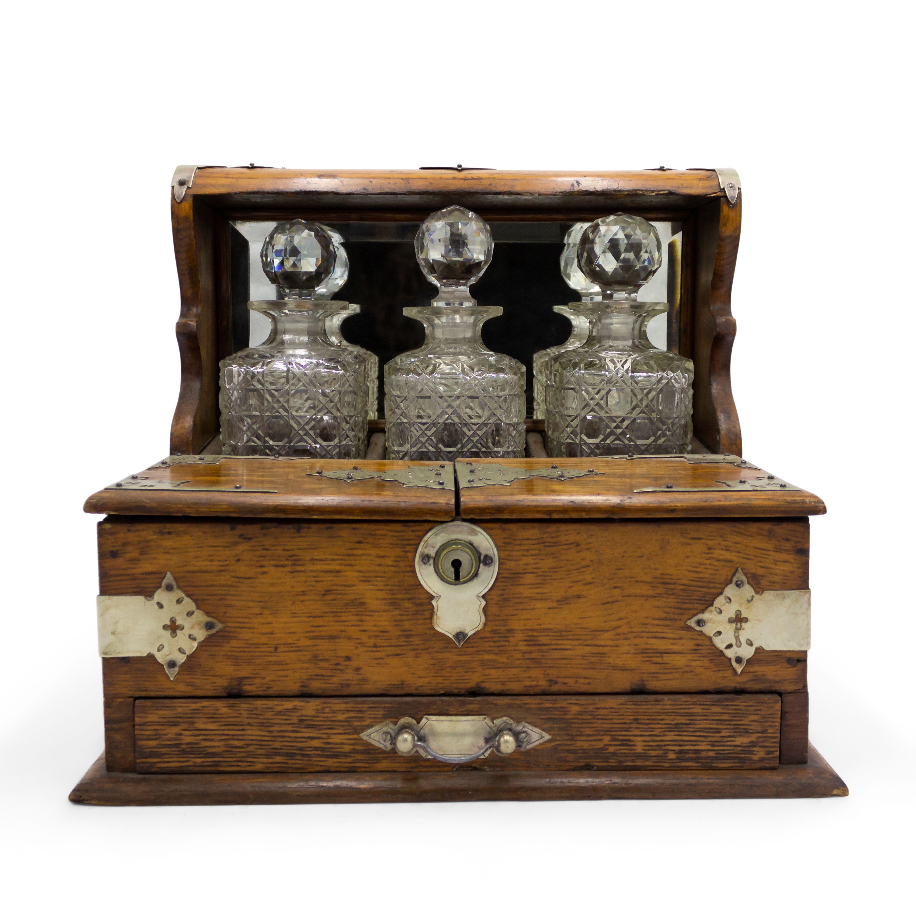 English Victorian oak tantalus case with 3 cut crystal decanters and drawer with silver plate fittings..