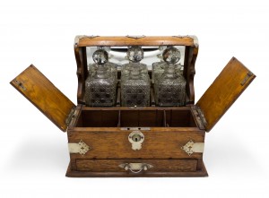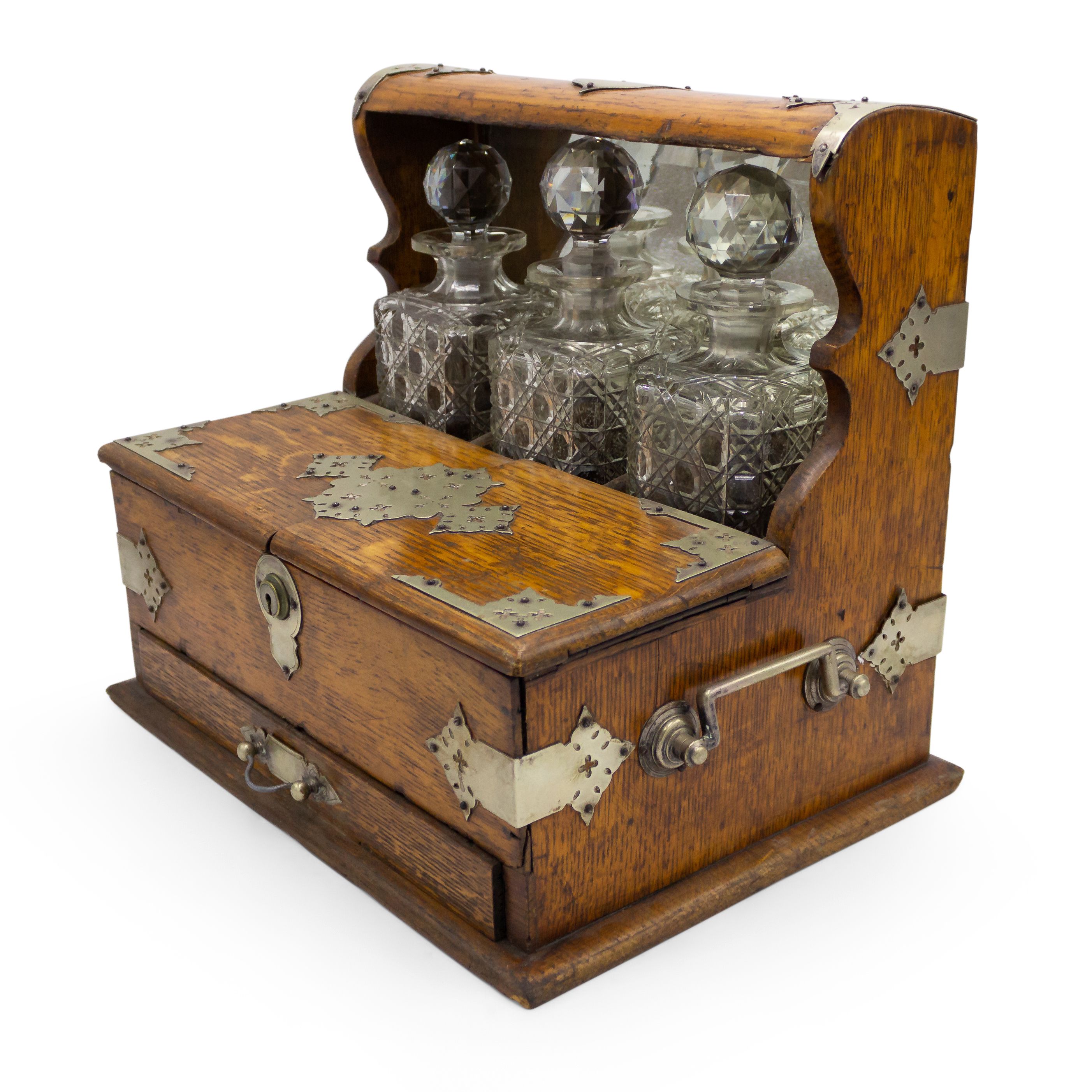 English Victorian oak tantalus case with 3 cut crystal decanters and drawer with silver plate fittings.