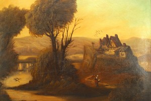 English Victorian style gilt framed oil painting of lady near house by stream. (similar to 053577)