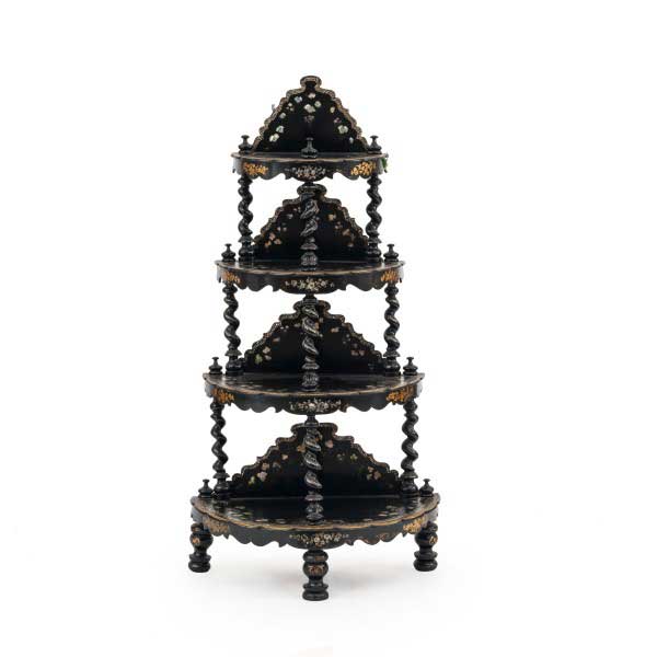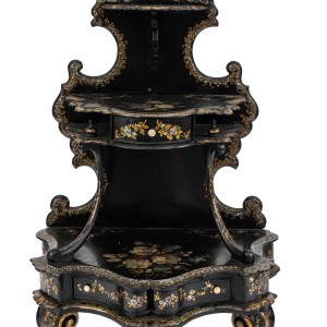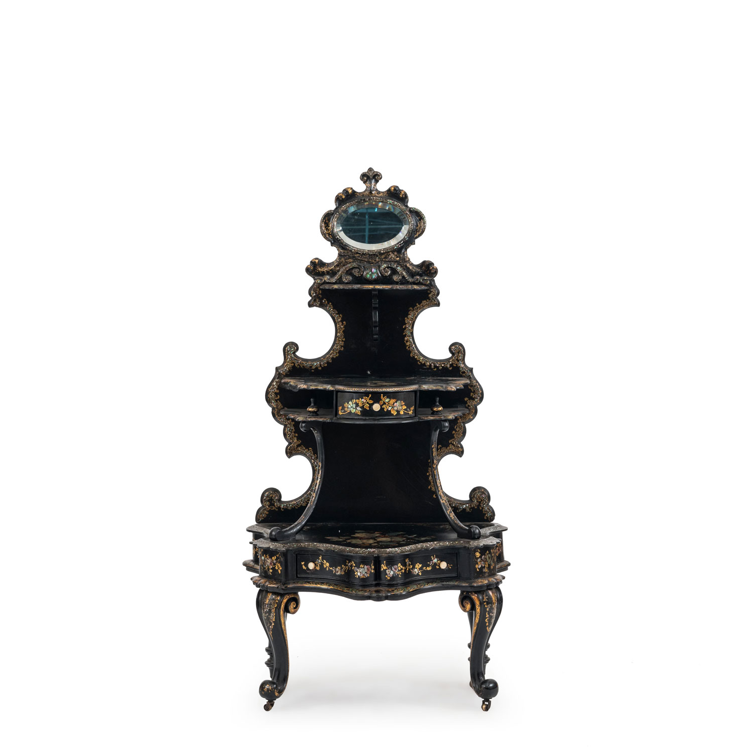 English Victorian Papier mache pearl inlaid black lacquered 3 tier etagere with oval mirror and 2 drawers..