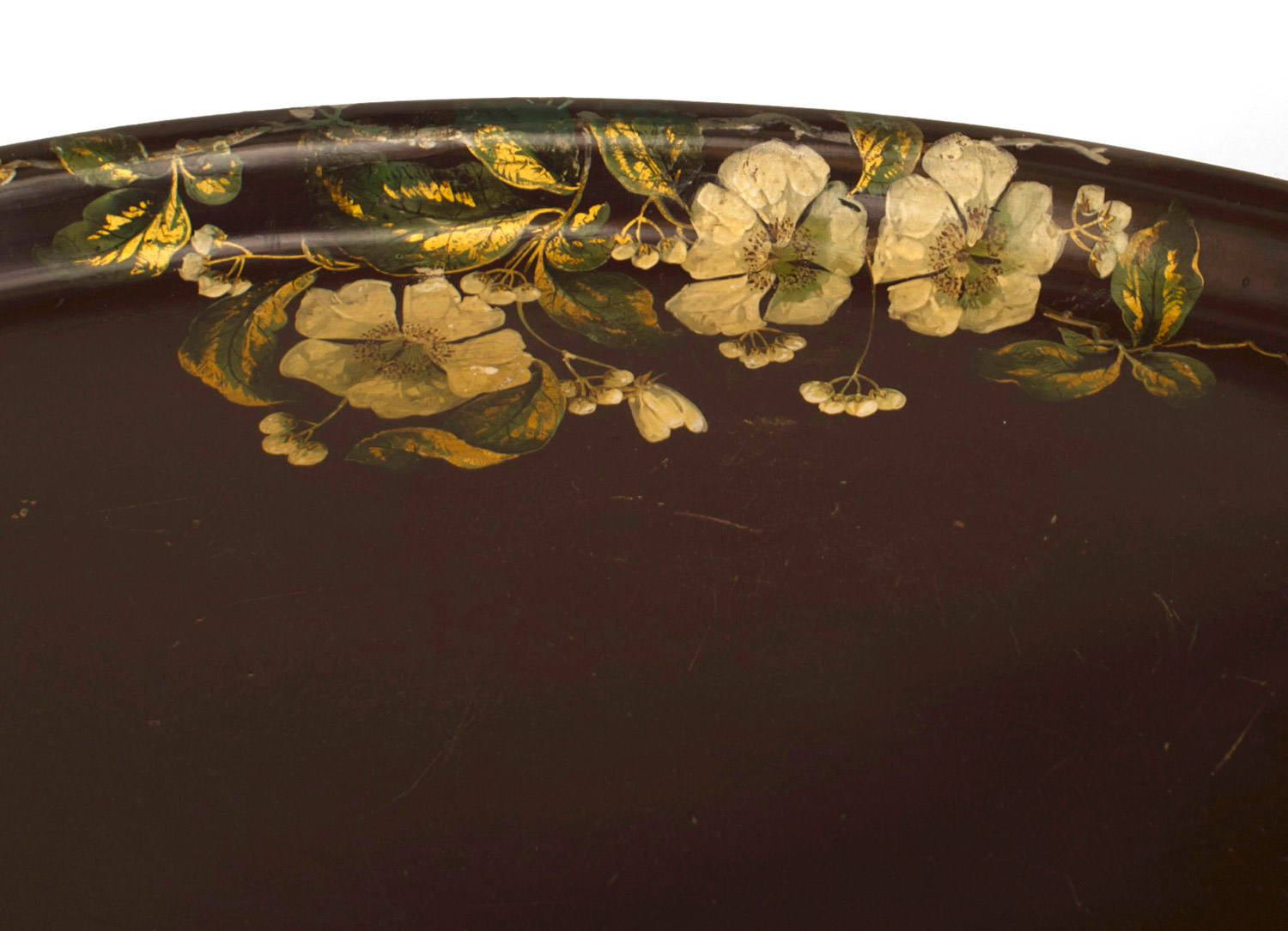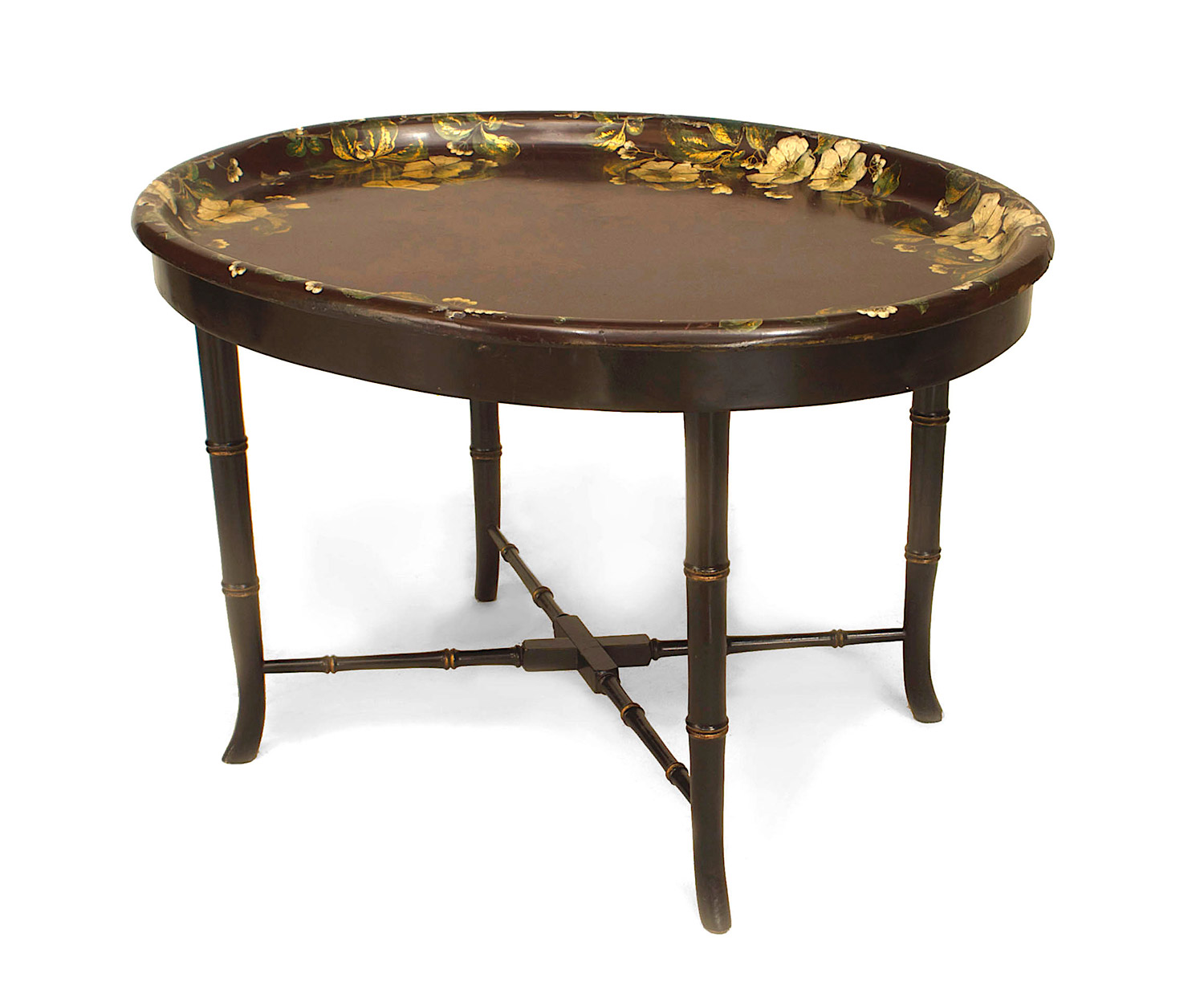 English Victorian-Style (20th Century) oval papier-mache dark maroon tray top coffee table with a floral decorative border and on an ebonized faux bamboo base.
