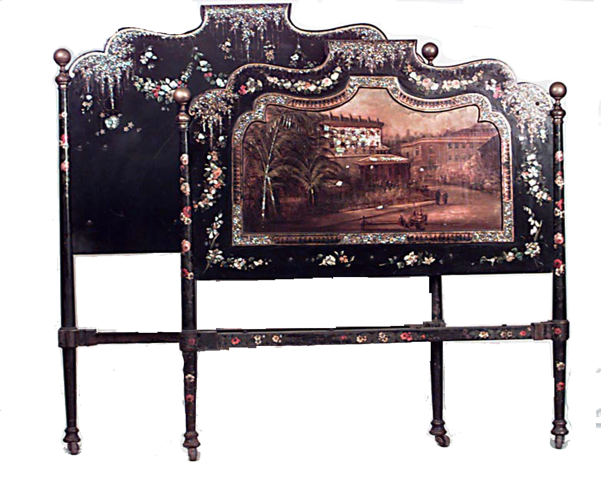 English Victorian papier-mache full size bed with lacquered Asian scene with brass finials. (includes: headboard, footboard, rails).