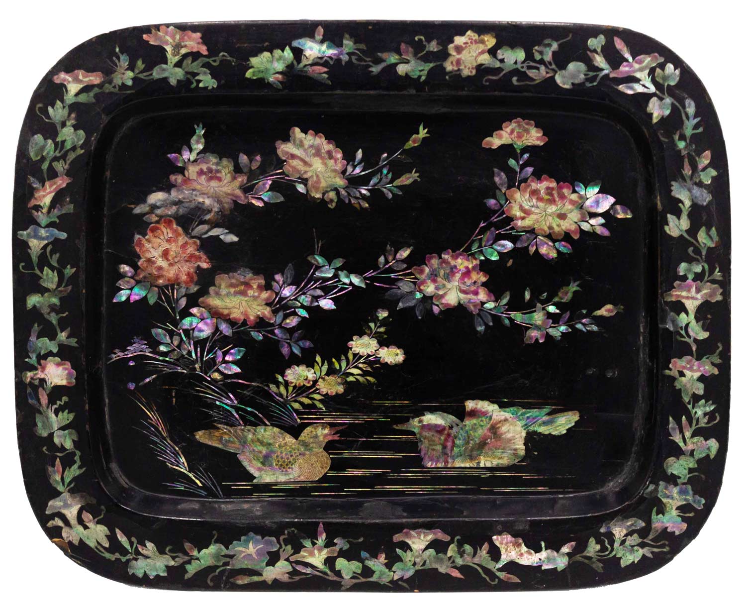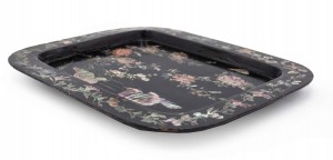 English Victorian papier mache rectangular tray with a black lacquered finish, pearl inlay design with birds and floral border, and rounded corners.