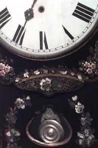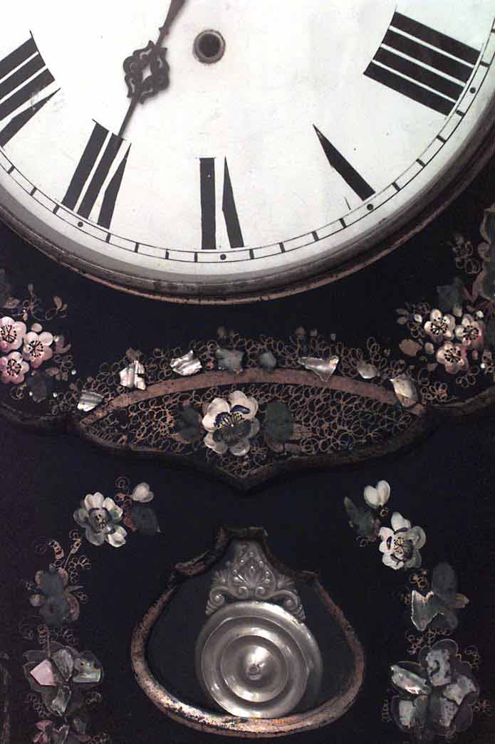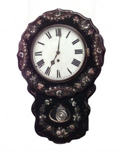 English Victorian papier mache pearl inlaid and decorated wall clock. (Not working).