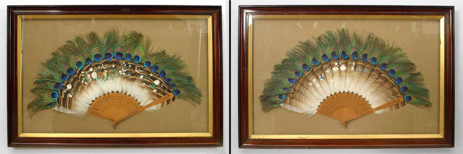 PAIR of English Victorian mahogany framed peacock-feather fan wall plaques (PRICED AS PAIR)..