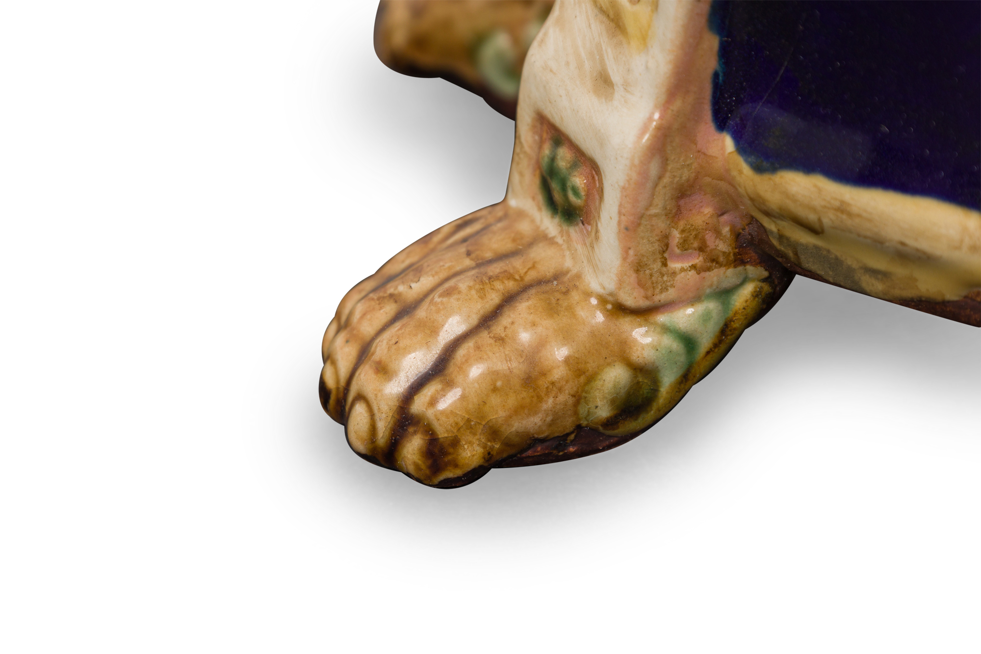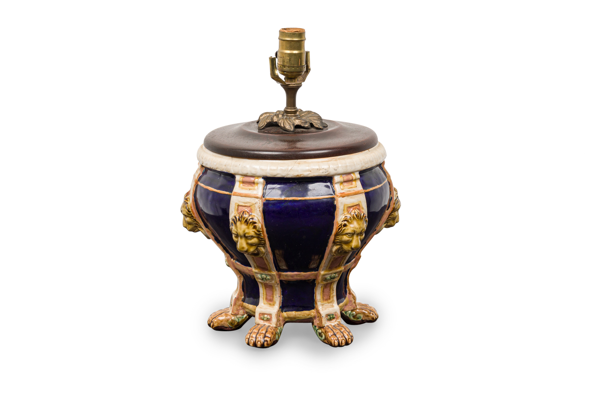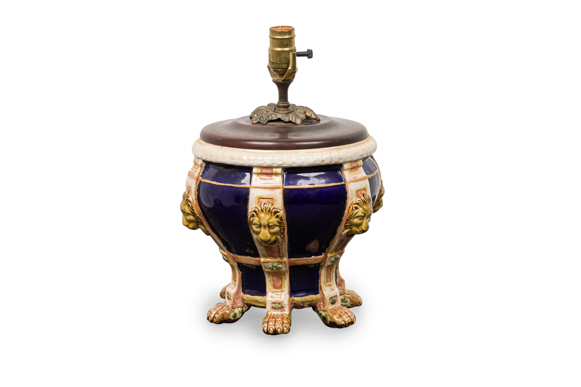 English Victorian blue and beige porcelain table lamp (possibly Minton) having a bulbous shape with 6 lion heads and resting on 6 claw feet.