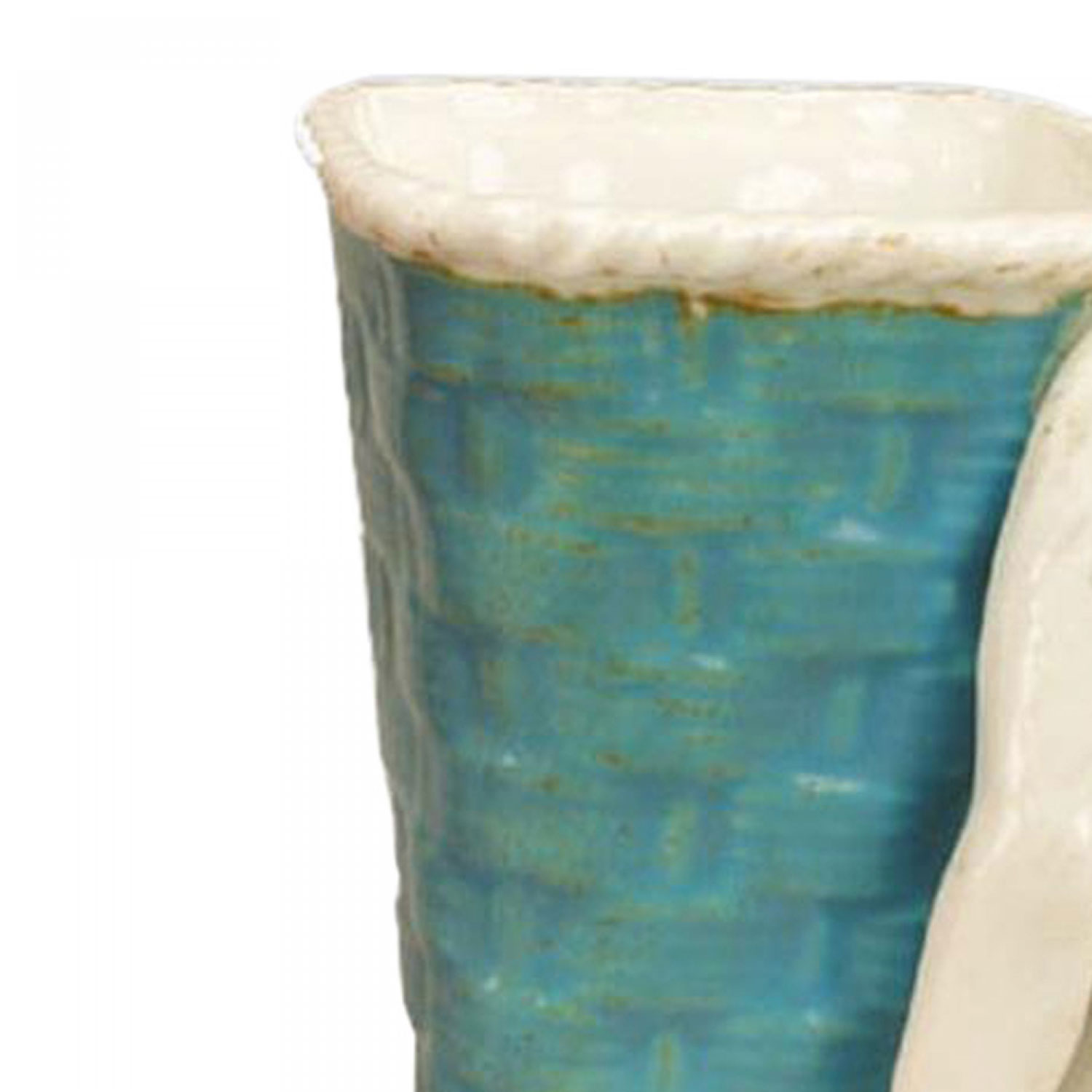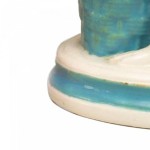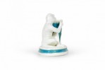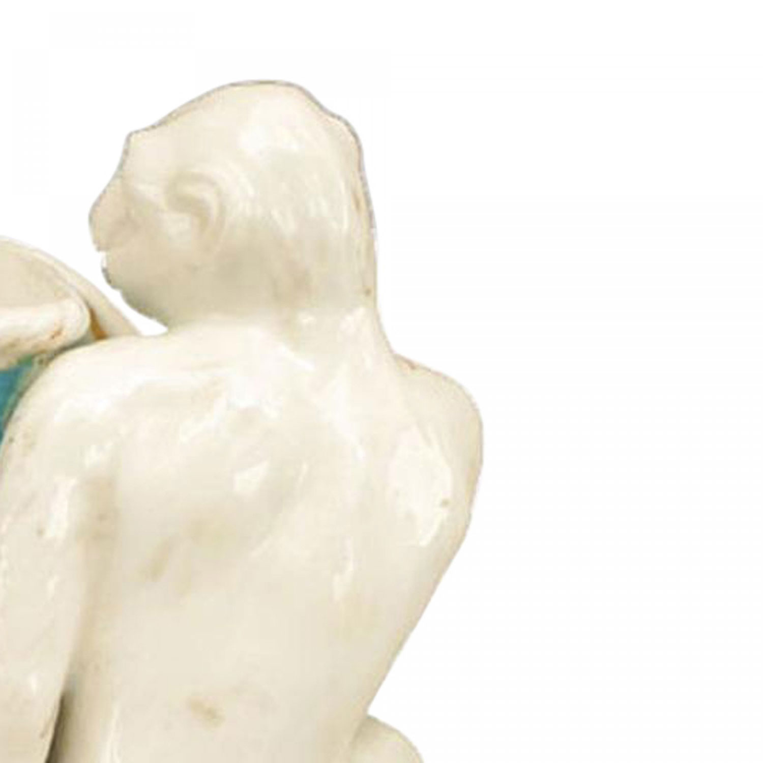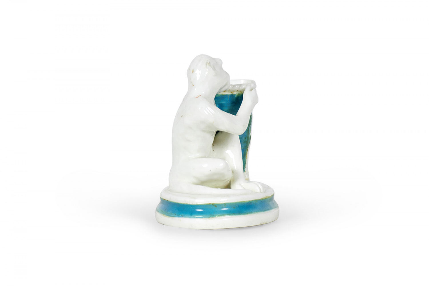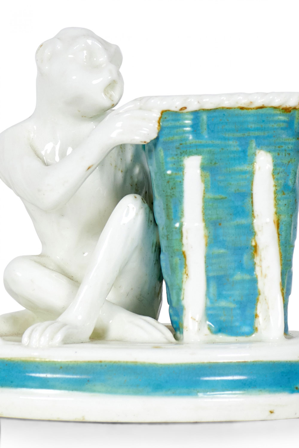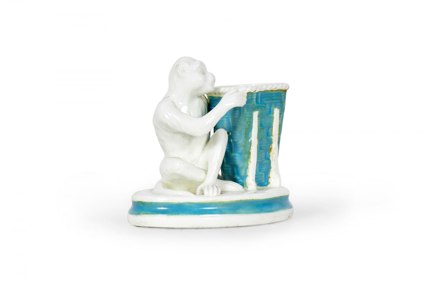 English Victorian porcelain vase with monkey seated next to a blue basket