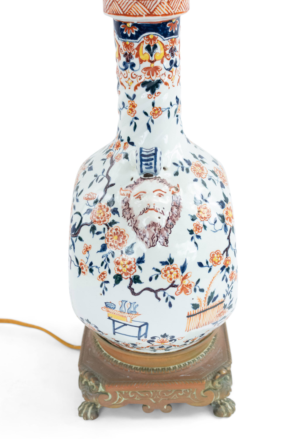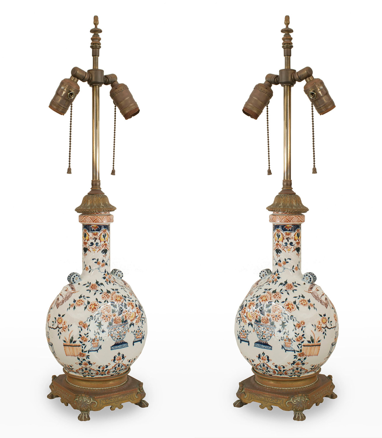 PAIR of English Victorian Pilgrim shaped white porcelain table lamps with red & blue floral decoration and satyr heads having a bronze square base with claw feet (PRICED AS PAIR)