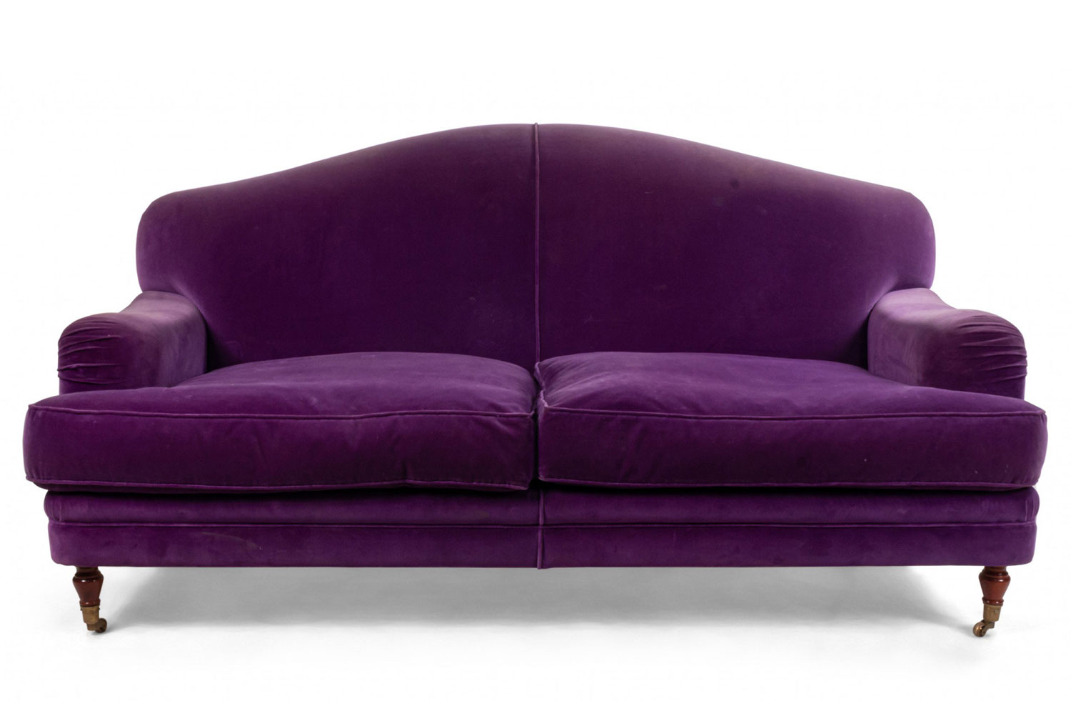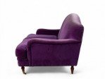 English Victorian style (modern) purple velvet loveseat with turned mahogany legs and 2 seat cushion, 2 red pillows, and 1 blue pillow.