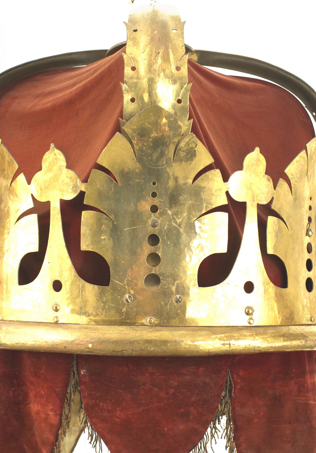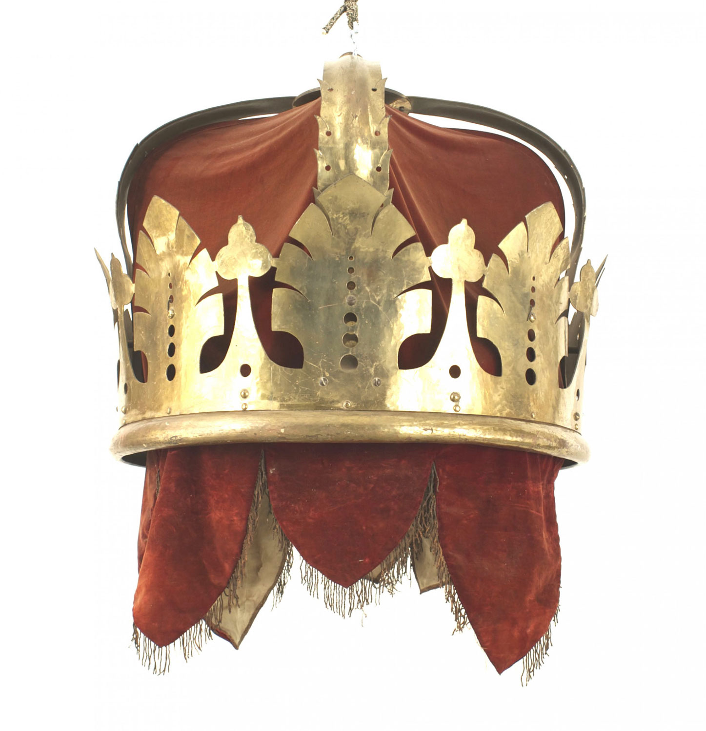 English Victorian-style (20th Century) brass crown shaped chandelier with club and spade design and red velvet upholstery..