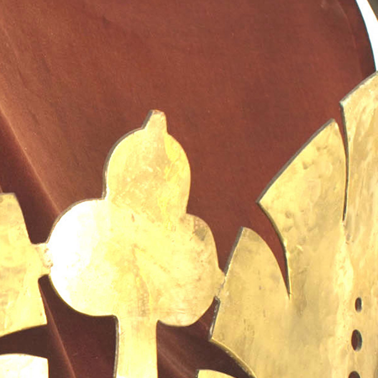 English Victorian-style (20th Century) brass crown shaped chandelier with club and spade design and red velvet upholstery.